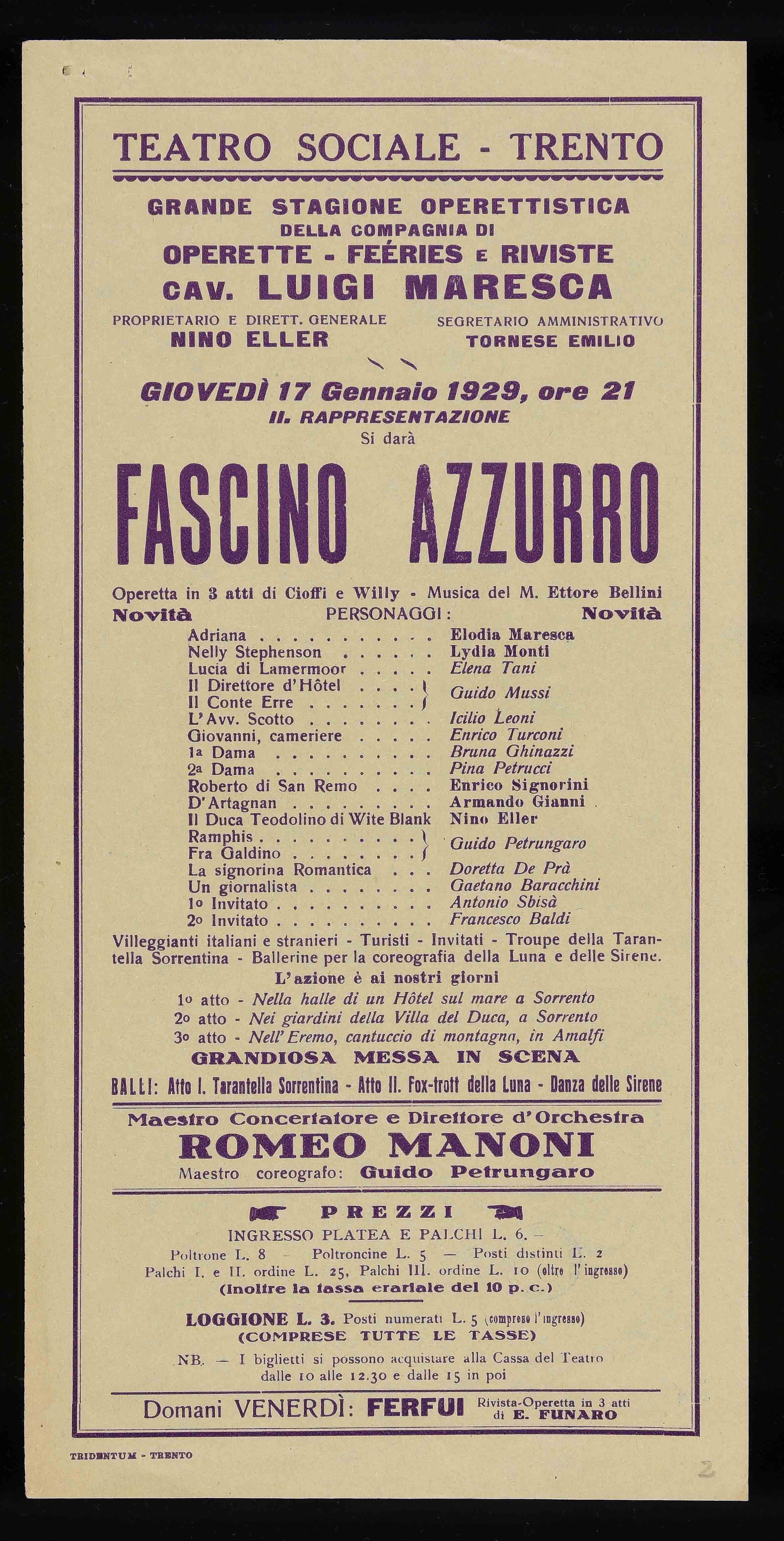 | Teatro Sociale – Trento. Giovedì 17 gennaio 1929, ore 21 |
