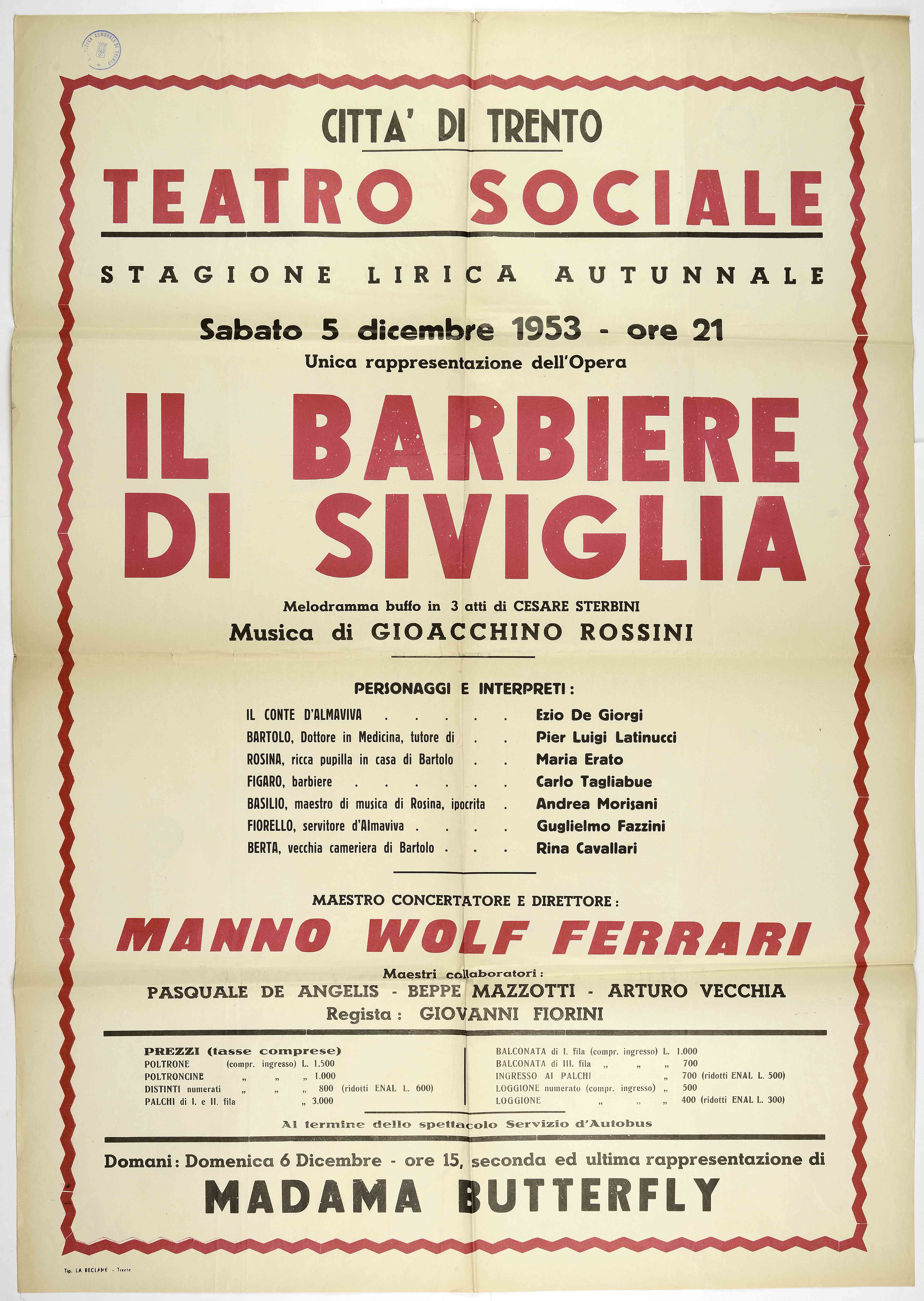 | Città di Trento – Teatro Sociale. Sabato 5 dicembre 1953 – ore 21 |
