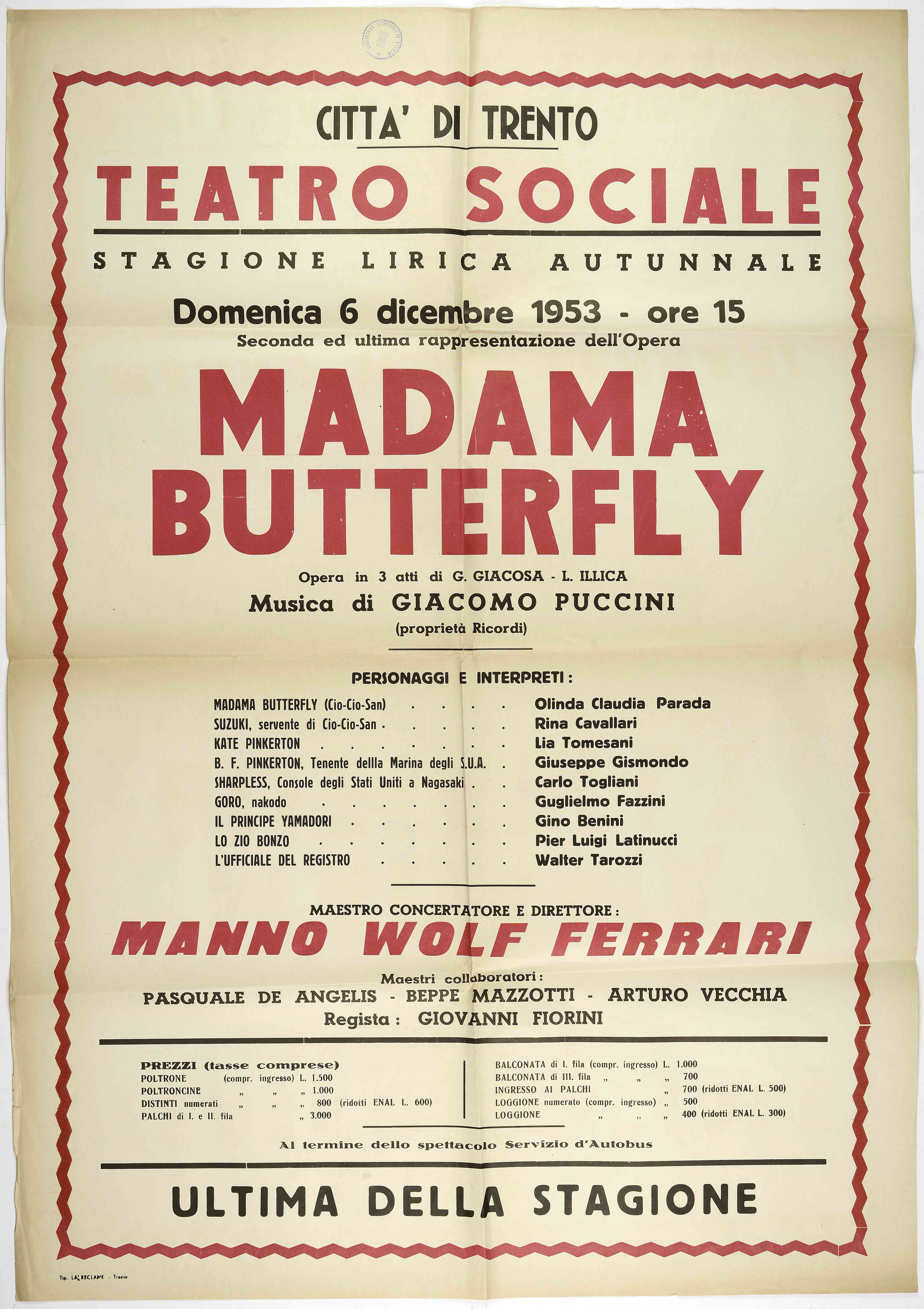 | Città di Trento – Teatro Sociale. Domenica 6 dicembre 1953 – ore 15 |