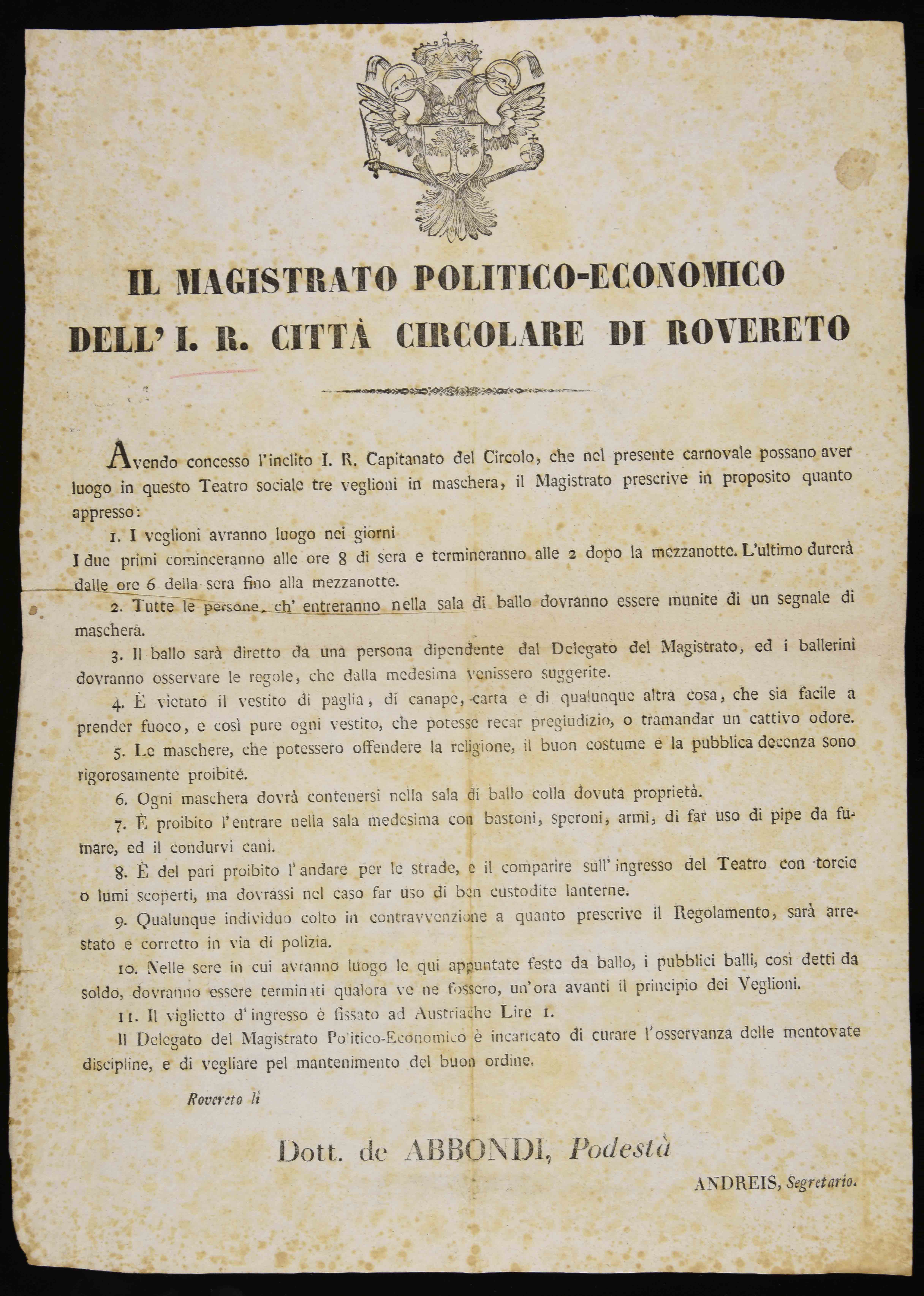 Proclama del Magistrato politico-economico di Rovereto che norma le feste previste al Teatro sociale di Rovereto per il carnevale. Data di stampa dagli estremi cronologici della carica del podestà Giovanni Abbondi (in carica fino al 1849, ma il Magistrato politico-economico viene soppresso nel 1848).