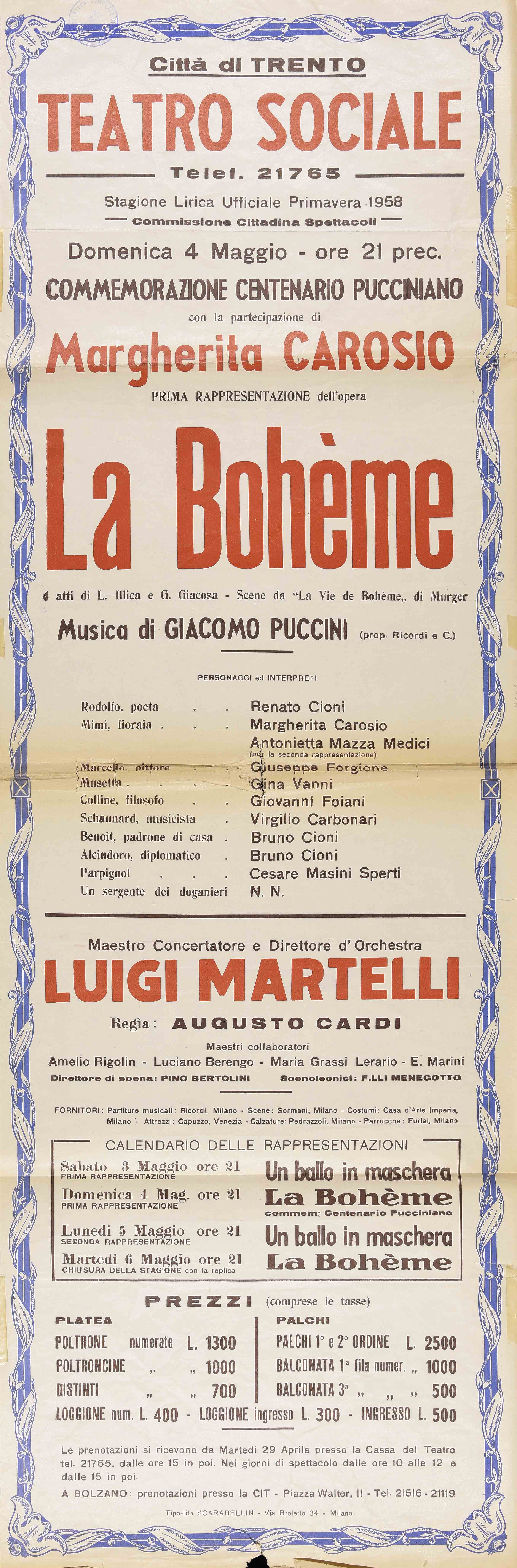 | Città di Trento – Teatro Sociale. Domenica 4 maggio 1958 – ore 21 prec. |