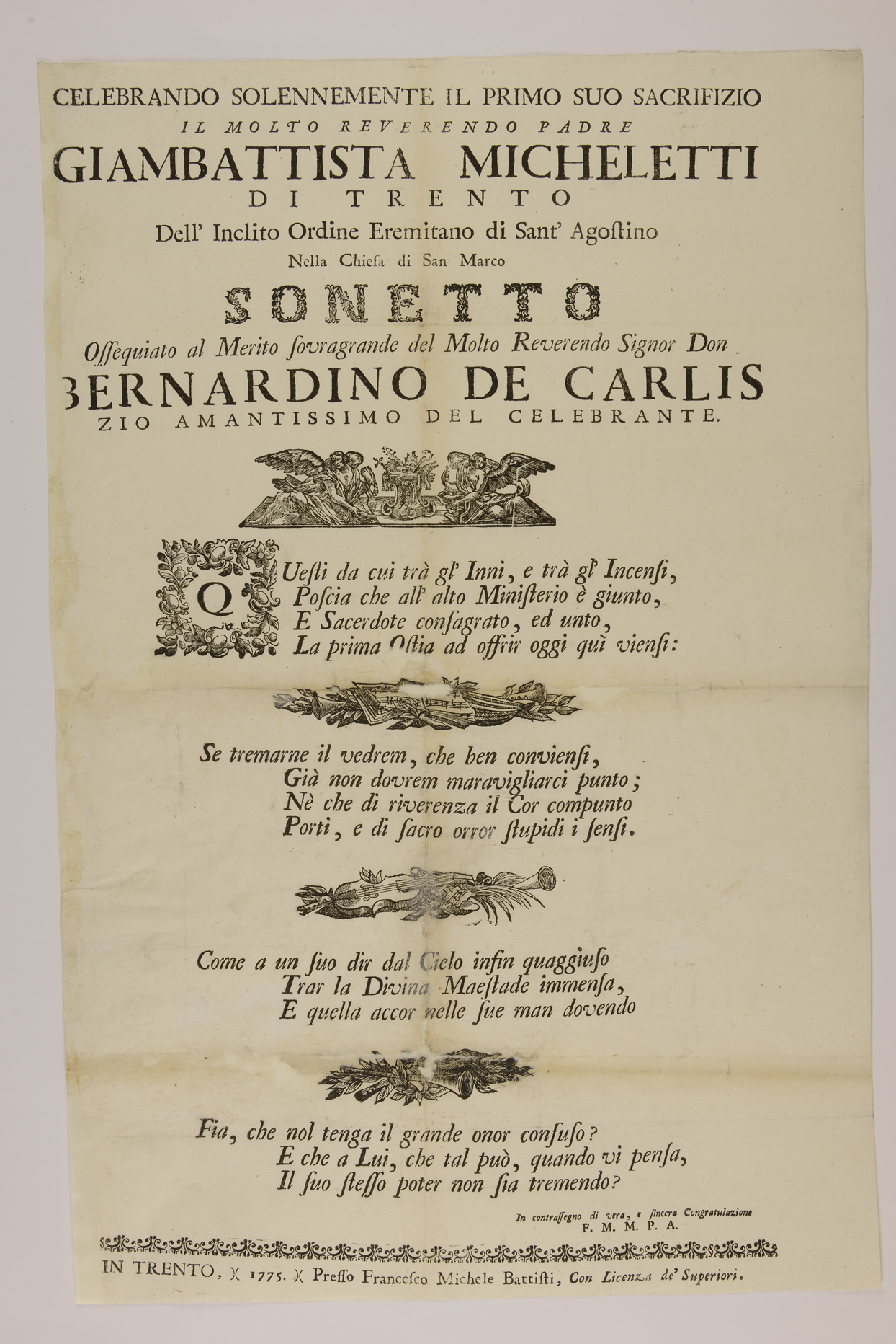 | Celebrando solennemente il primo suo sacrifizio il molto reverendo padre Giambattista Micheletti di Trento ... |