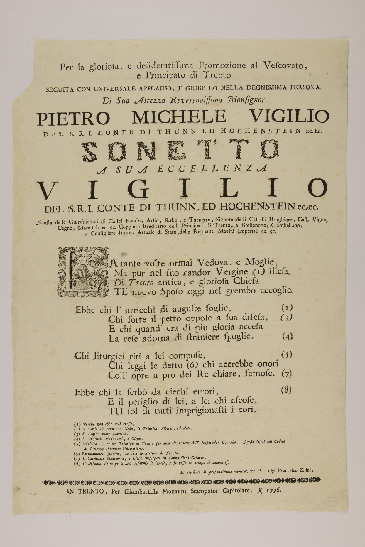 | Per la gloriosa e desideratissima promozione al vescovato e principato di Trento seguita con universale applauso e giubbilo nella degnissima persona di sua altezza reverendissima monsignor Pietro Michele Vigilio del S.R.I. conte di Thunn ed Hochenstein ec. ec. Sonetto a sua eccellenza Vigilio del S.R.I. conte di Thunn ed Hochenstein ec. ec. |
