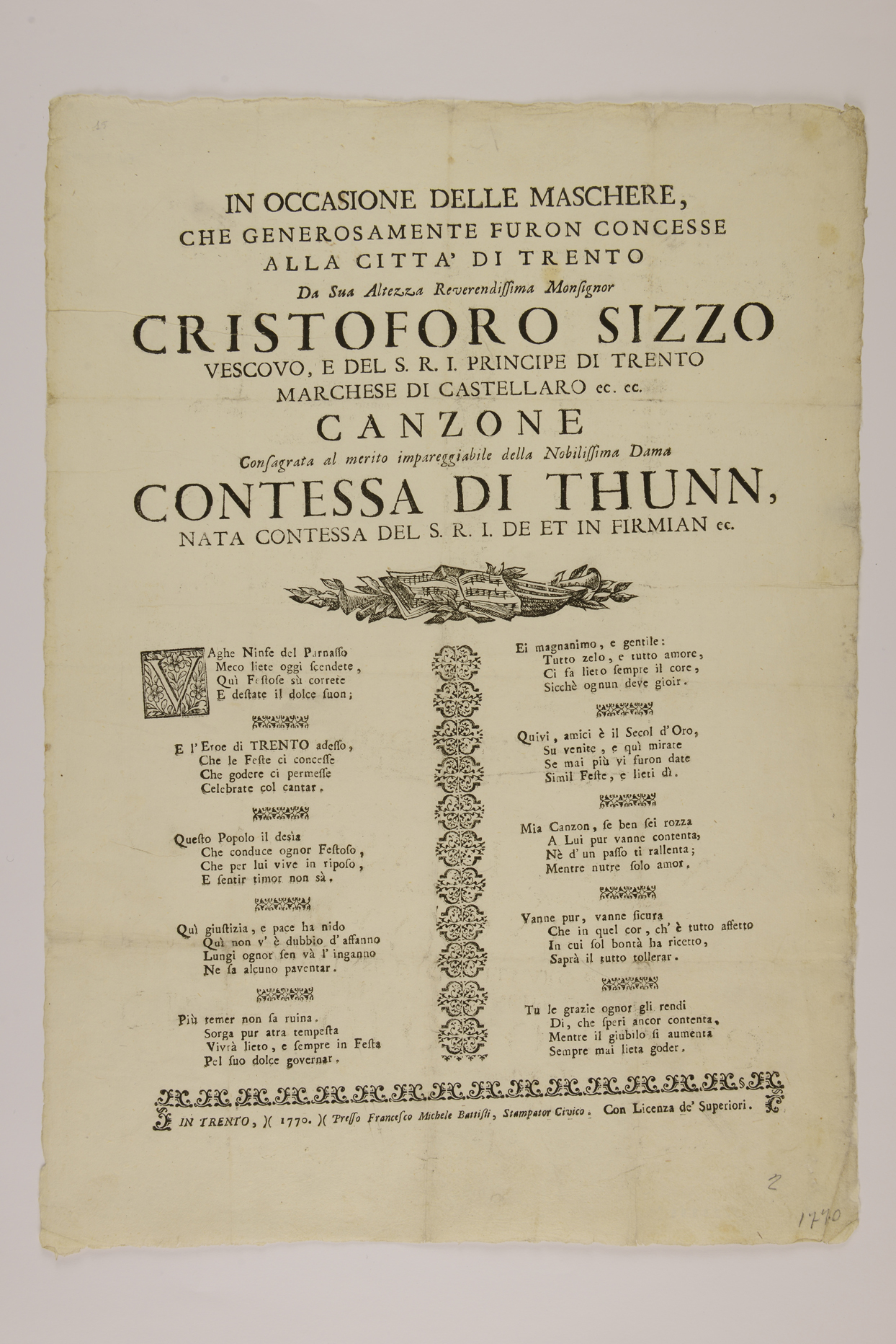 | In occasione delle maschere che generosamente furon concesse alla città di Trento da sua altezza reverendissima monsignor Cristoforo Sizzo vescovo e del S.R.I. principe di Trento marchese di Castellaro ec. ec. Canzone consagrata al merito impareggiabile della nobilissima dama contessa di Thun, nata contessa del S.R.I. de et in Firmian ec. |