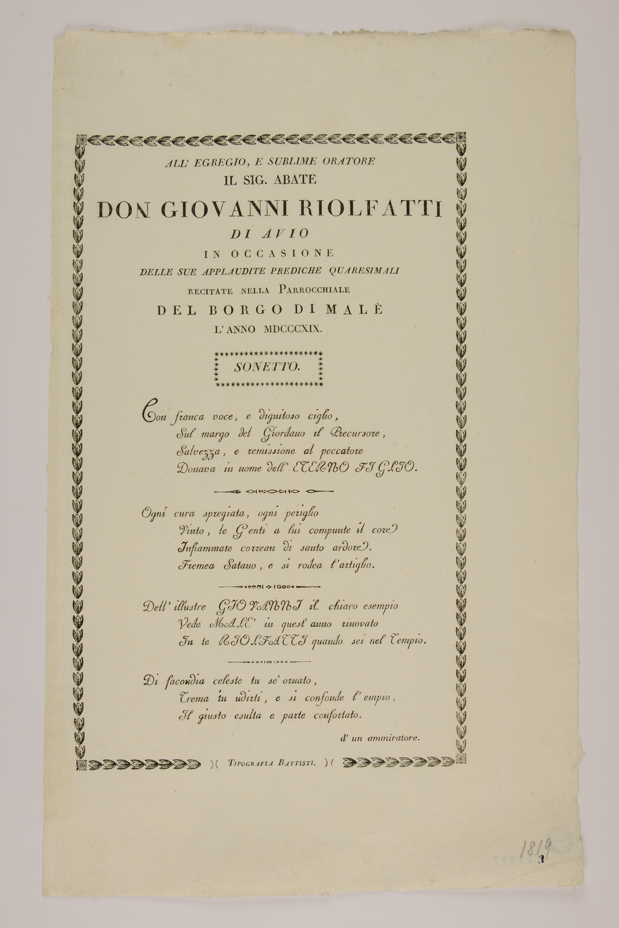 | All'egregio e sublime oratore il sig. abate don Giovanni Riolfatti di Avio in occasione delle sue applaudite prediche quaresimali ... |