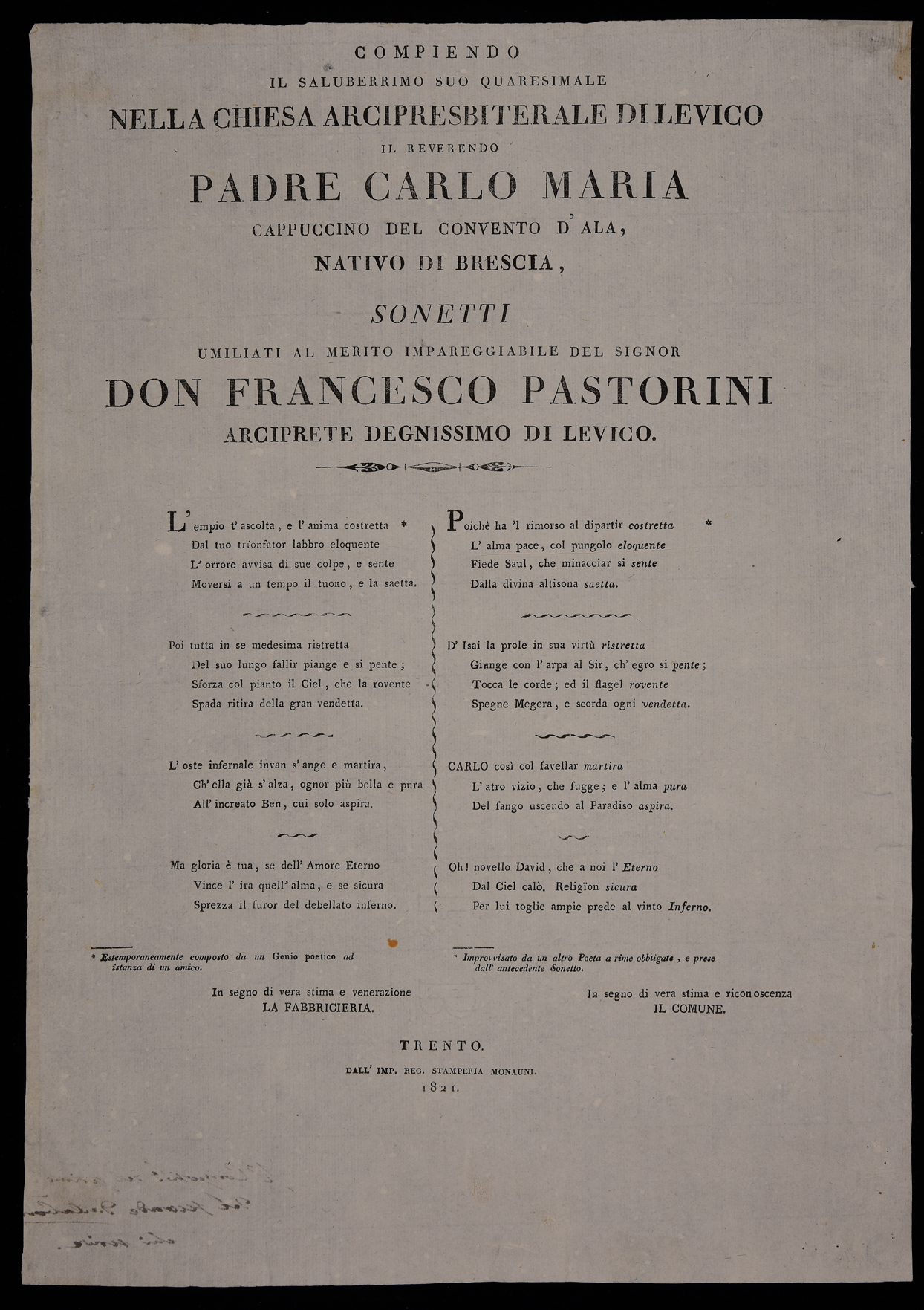 | Compiendo il saluberrimo suo quaresimale nella chiesa arcipresbiterale di Levico il reverendo padre Carlo Maria cappucino del convento d'Ala, nativo di Brescia, sonetti ... |