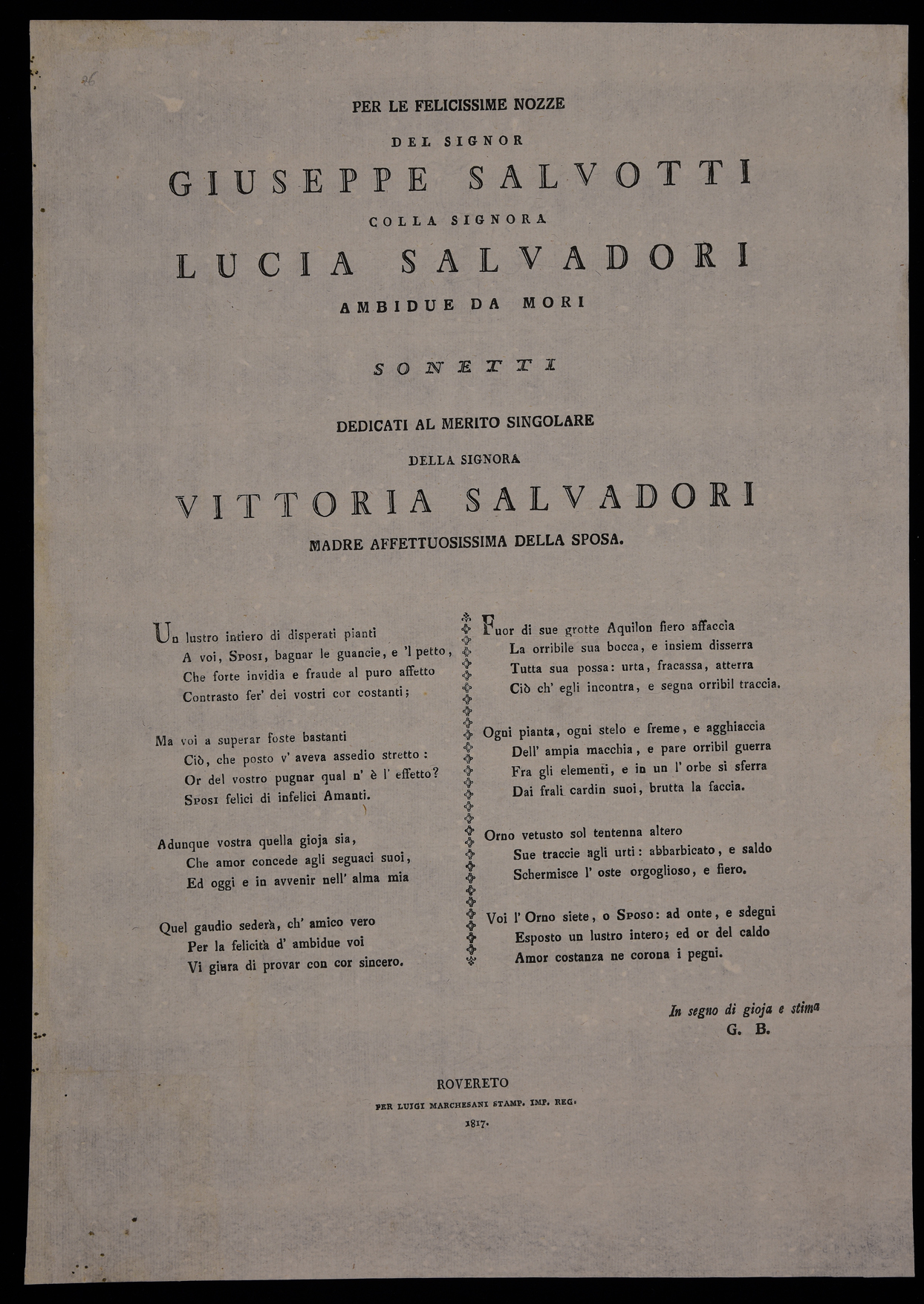 | Per le felicissime nozze del signor Giuseppe Salvotti colla signora Lucia Salvadori ambidue da Mori. Sonetti dedicati al merito singolare della signora Vittoria Salvadori madre affettuosissima della sposa |