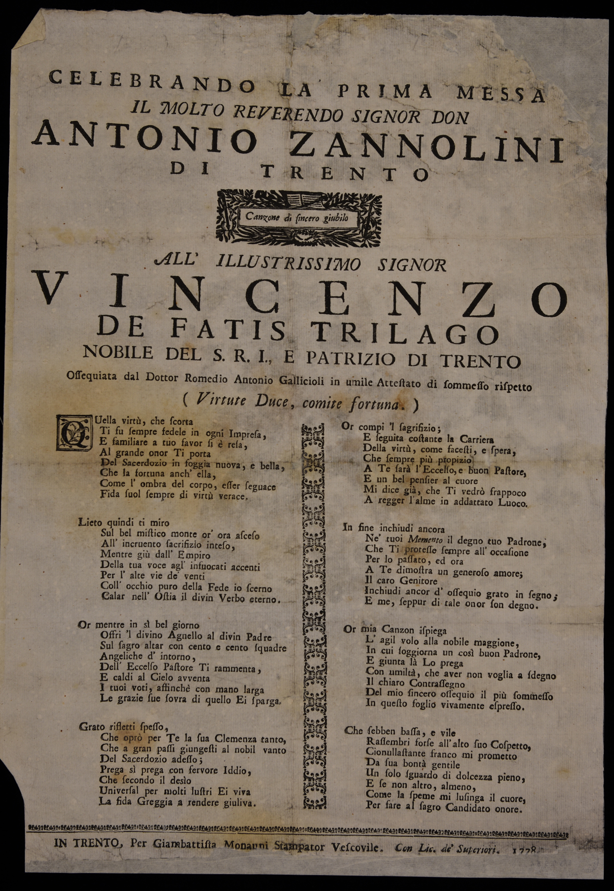 | Celebrando la prima messa il molto reverendo signor don Antonio Zannolini di Trento, canzone ... |