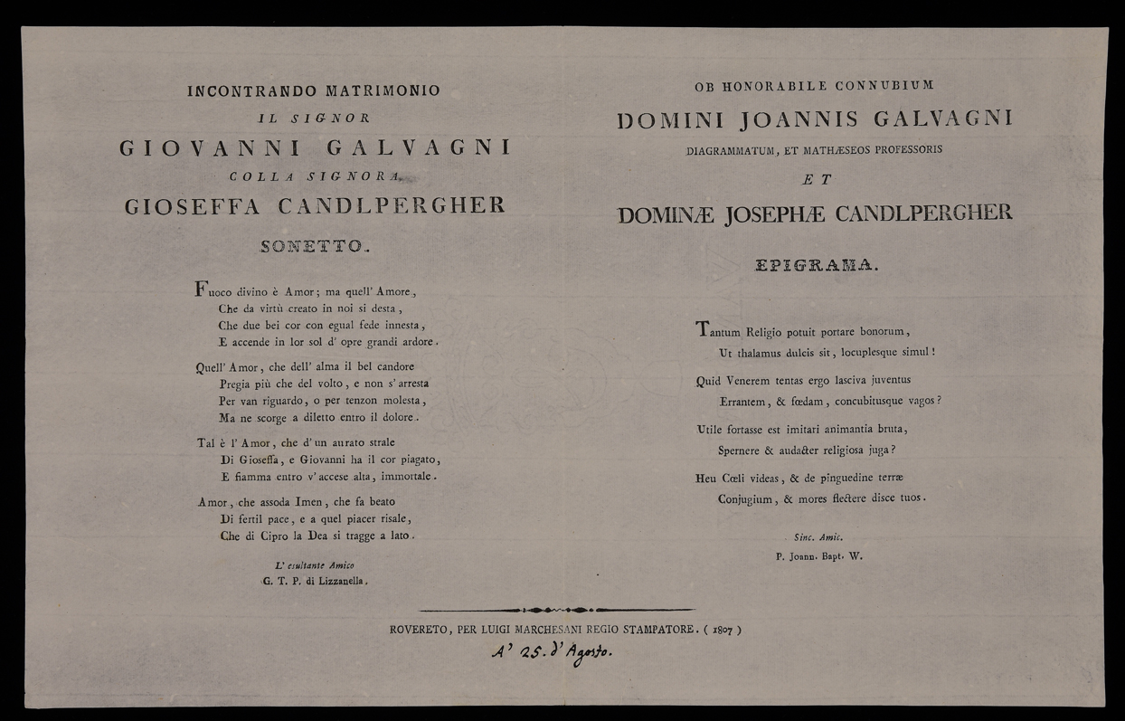 | Incontrando matrimonio il signor Giovanni Galvagni colla signora Gioseffa Candlpergher, sonetto |