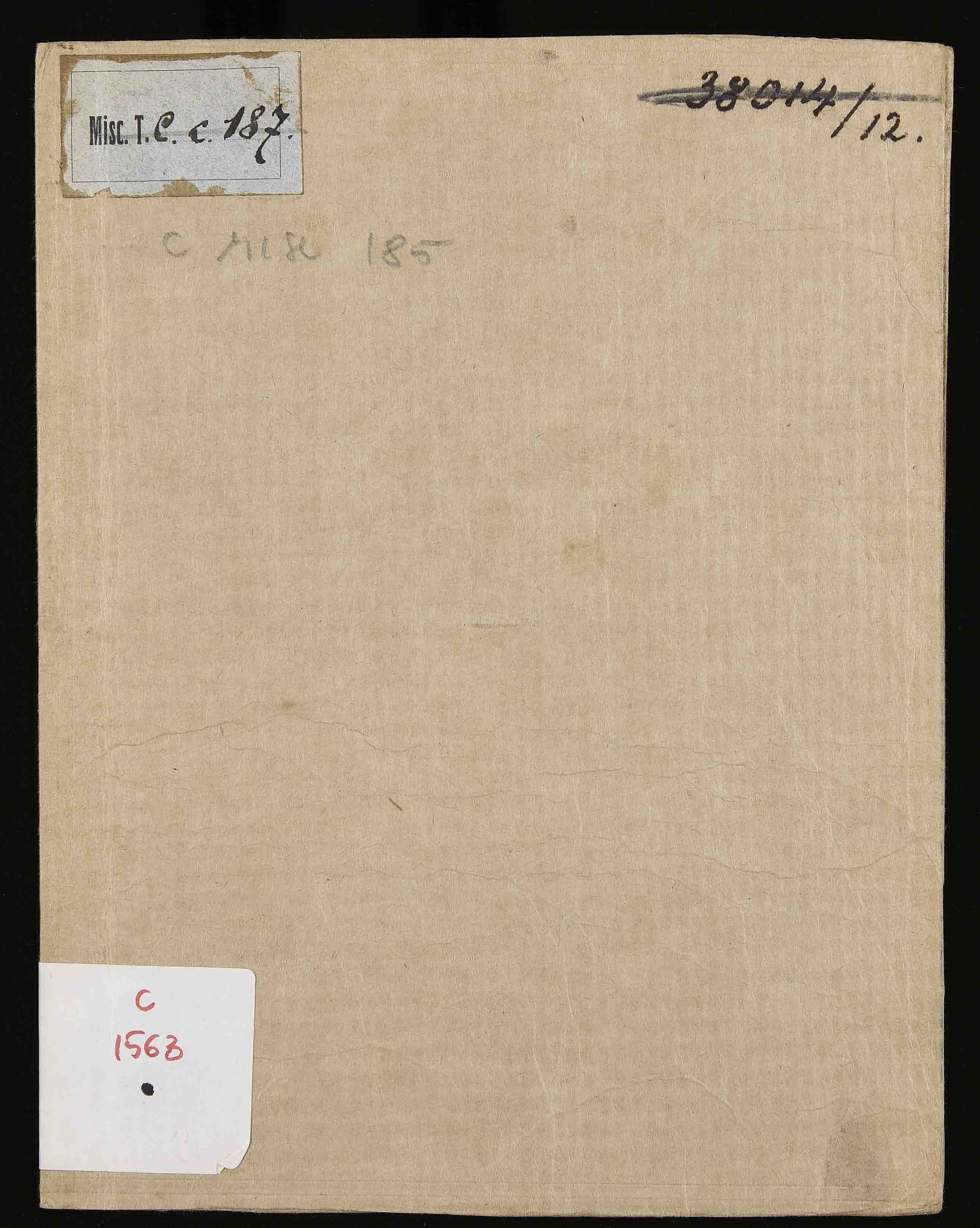 Legatura in cartoncino del XIX sec., 200x155 mm. Antiche segnature di collocazione: 38014/12, Misc TC c 87 e G 2 op f 161.