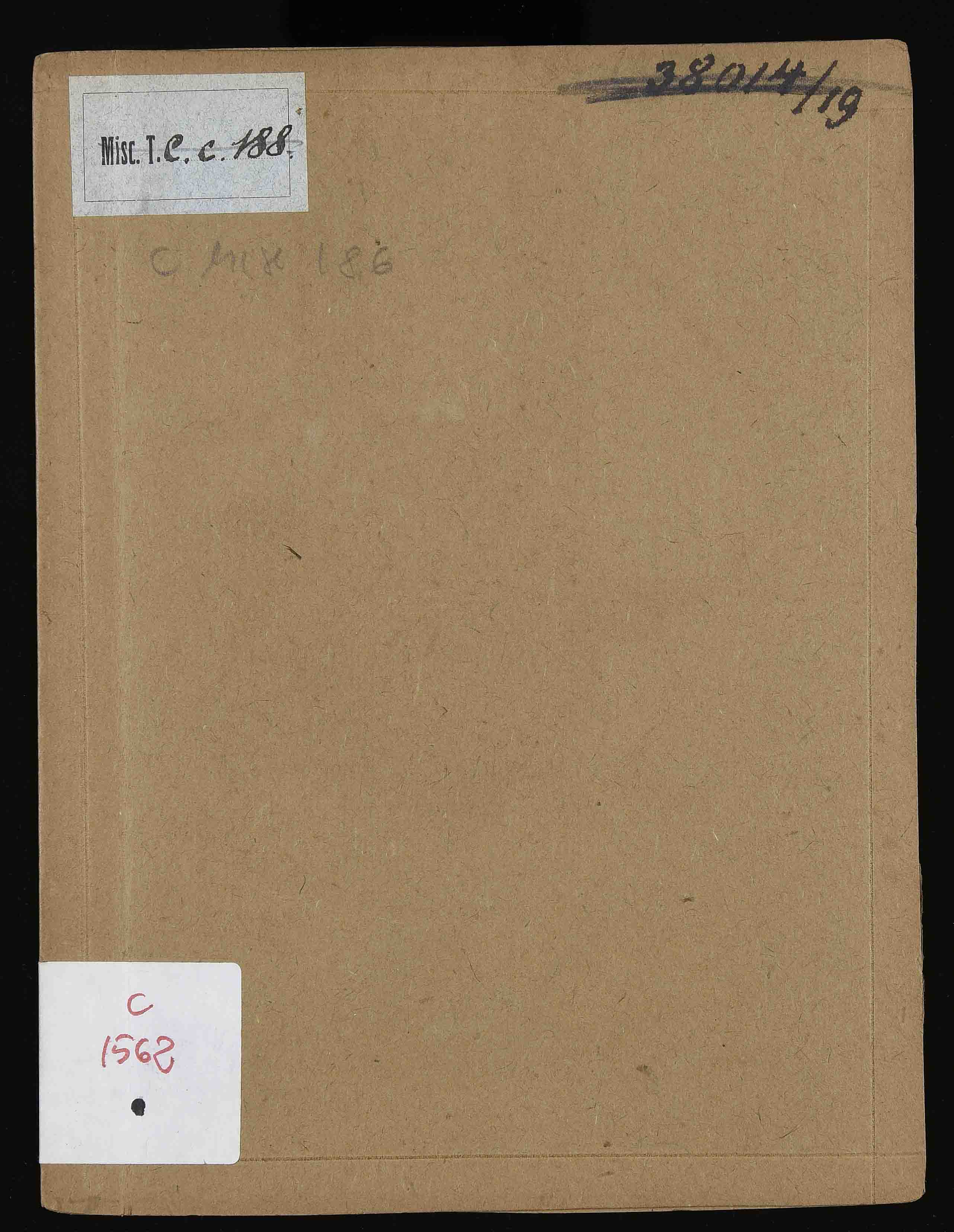 Legatura in cartoncino del XIX sec., 200x155 mm. Antiche segnature di collocazione: 38014/19, Misc TC c 188 e G 2 op f 162.
