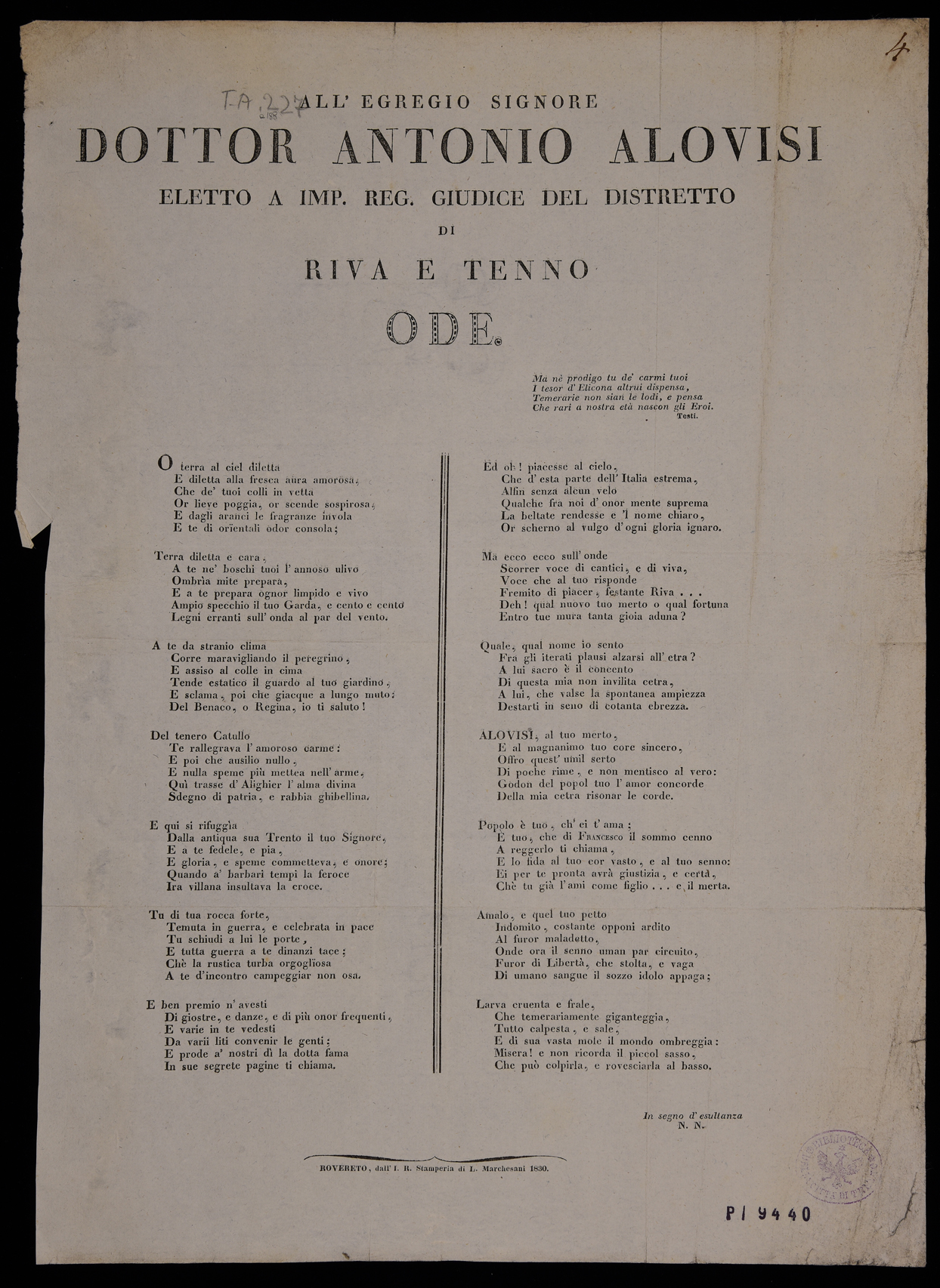 | All'egregio signore dottor Antonio Alovisi eletto a imp. reg. giudice del distretto di Riva e Tenno, ode |