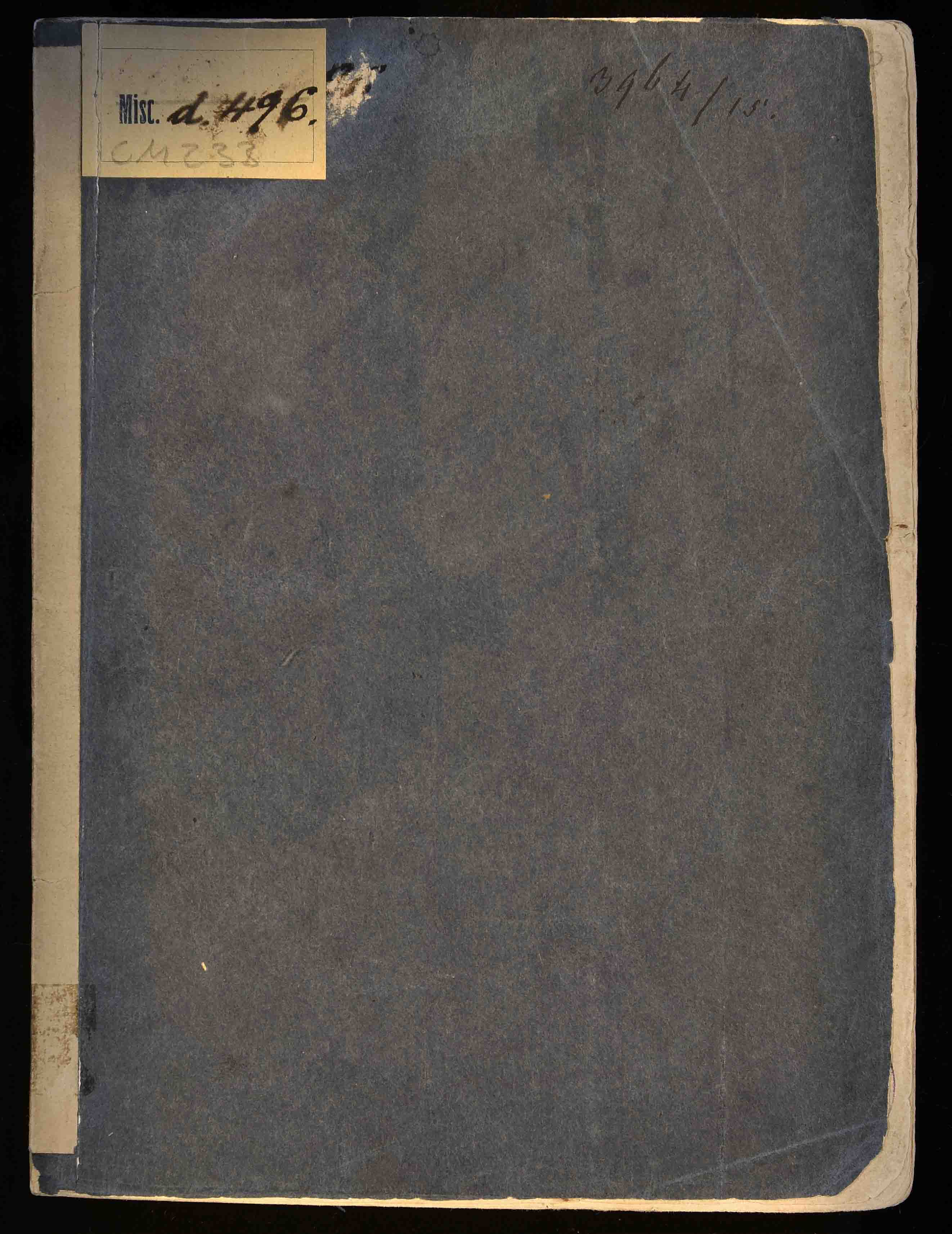 Legatura in carta del XIX sec., 195x145x5 mm. Manca c. G4 (probabilmente bianca). Antiche segnature di collocazione: 3964/15, Misc. d 496.