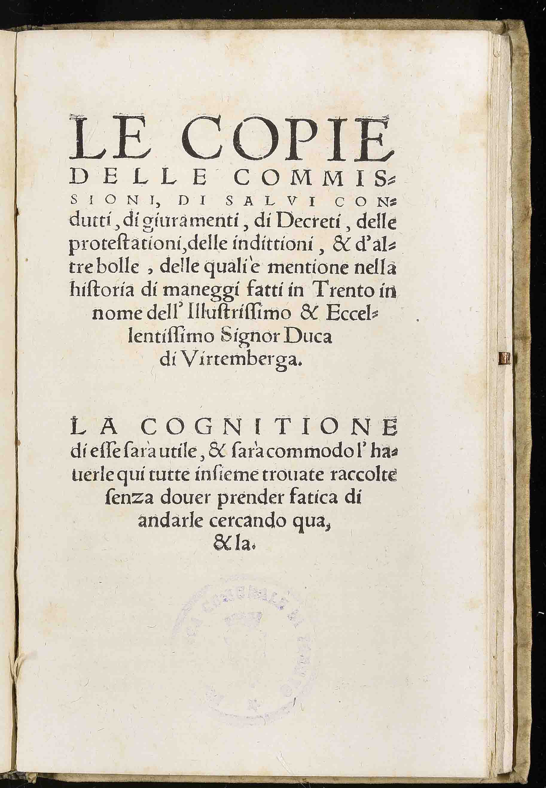 | Le copie delle commissioni, di salvi condutti, di giuramenti, di decreti, delle protestationi, delle indittioni, & d'altre bolle, delle quali è mentione nella historia di maneggi fatti in Trento in nome dell'illustrissimo & eccellentissimo signor duca di Virtemberga |
