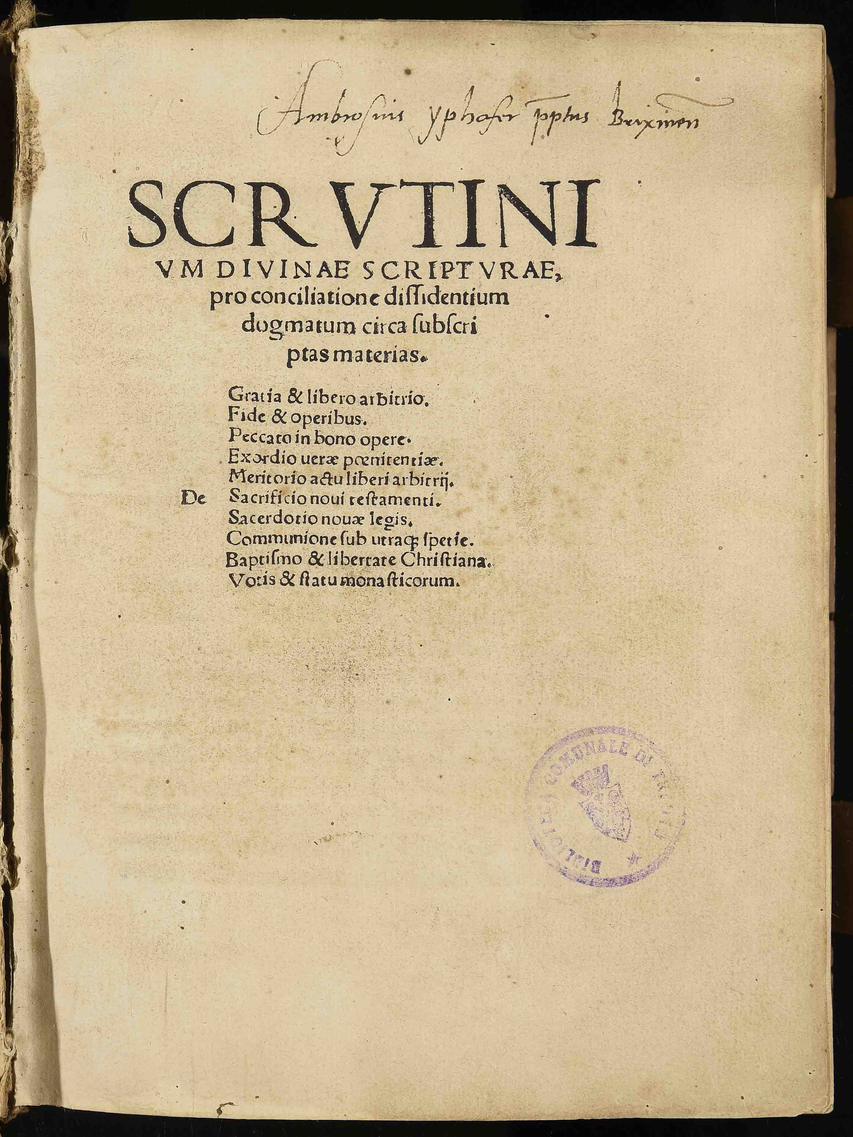 | Scrutinium divinae scripturae, pro conciliatione dissidentium dogmatum circa subscriptas materias. De gratia & libero arbitrio. De fide & operibus. De peccato in bono opere. De exordio verae poenitentiae. De meritorio actu liberi arbitrii. De sacrificio novi testamenti. De sacerdotio novae legis. De communione sub utraque spetie. De baptismo & liberate christiana. De votis & statu monasticorum |