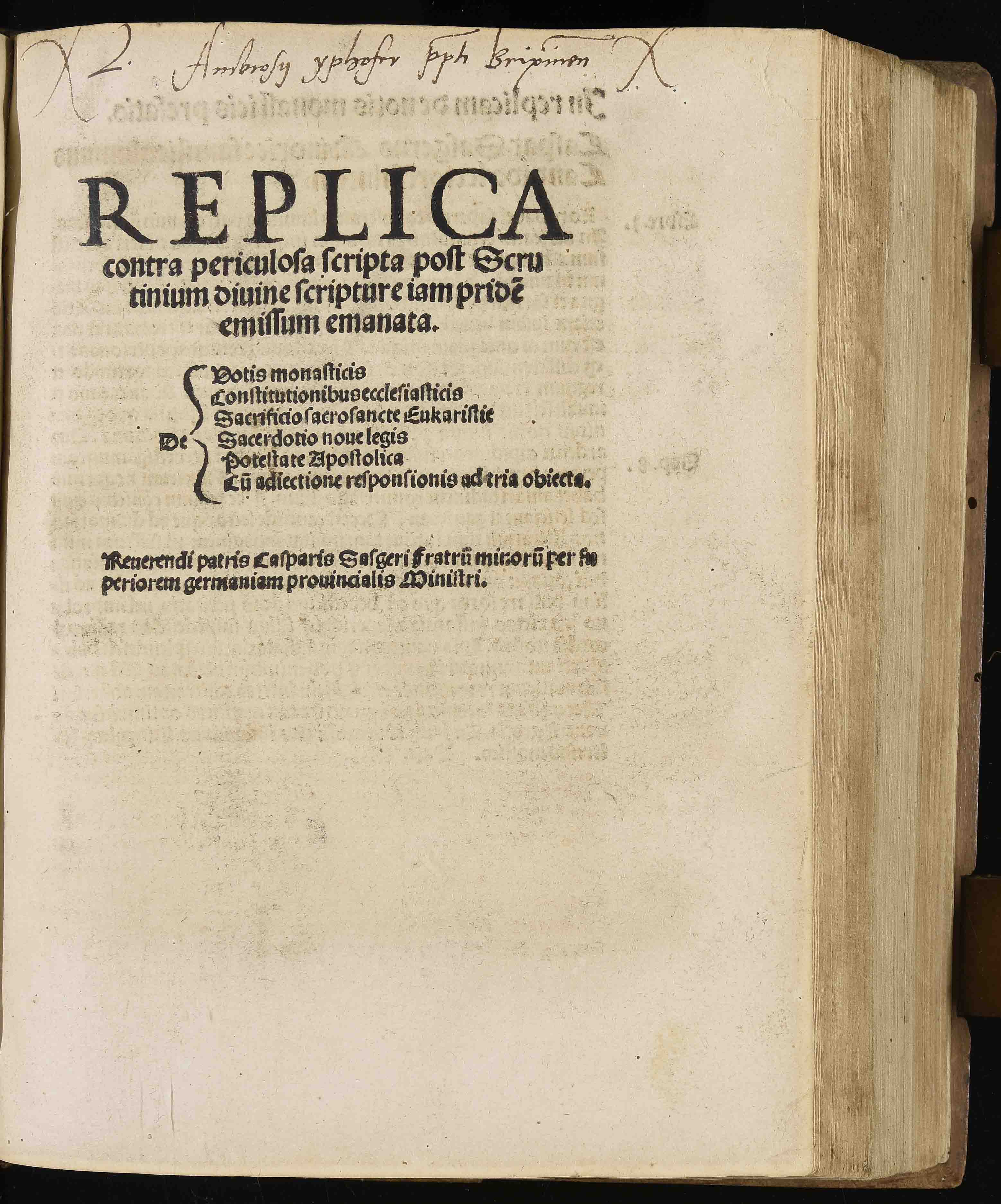| Replica contra periculosa scripta post scrutinium divine scripture iam pridem emissum emanata. De dotis monasticis. De contitutionibus ecclesiasticis. De sacrificio sacrosanctae Eukaristie. De sacerdotio nove legis. De potestate apostolica. Cum adiectione responsionis ad tria obiecta |