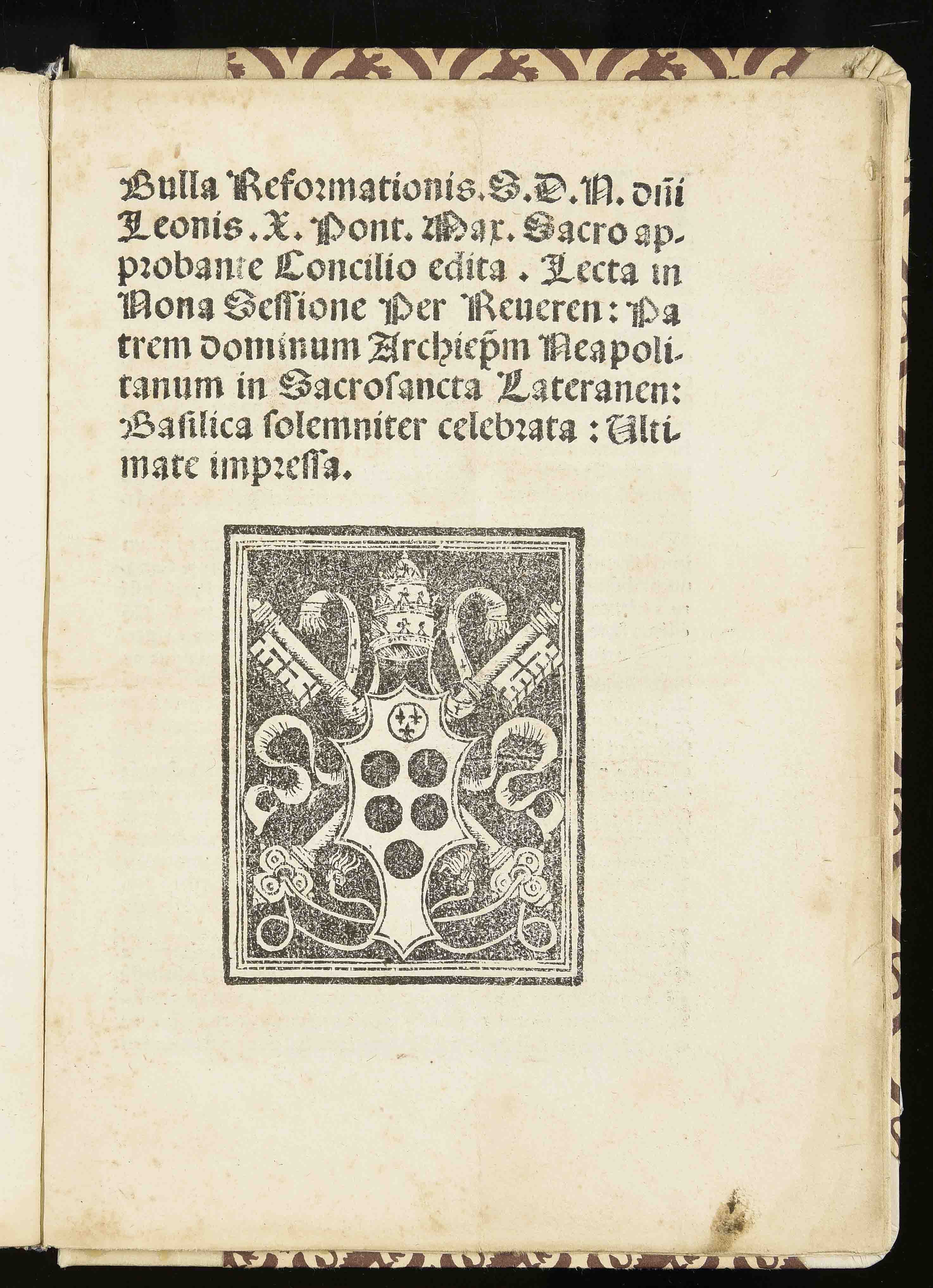 | Bulla reformationis S.D.N. domini Leonis X pont. max. sacro approbante Concilio edita. Lecta in nona sessione per reverendum patrem dominum archiepiscopum Neapolitanum in sacrosancta Lateranense basilica solemniter celebrata. Ultimate impressa |