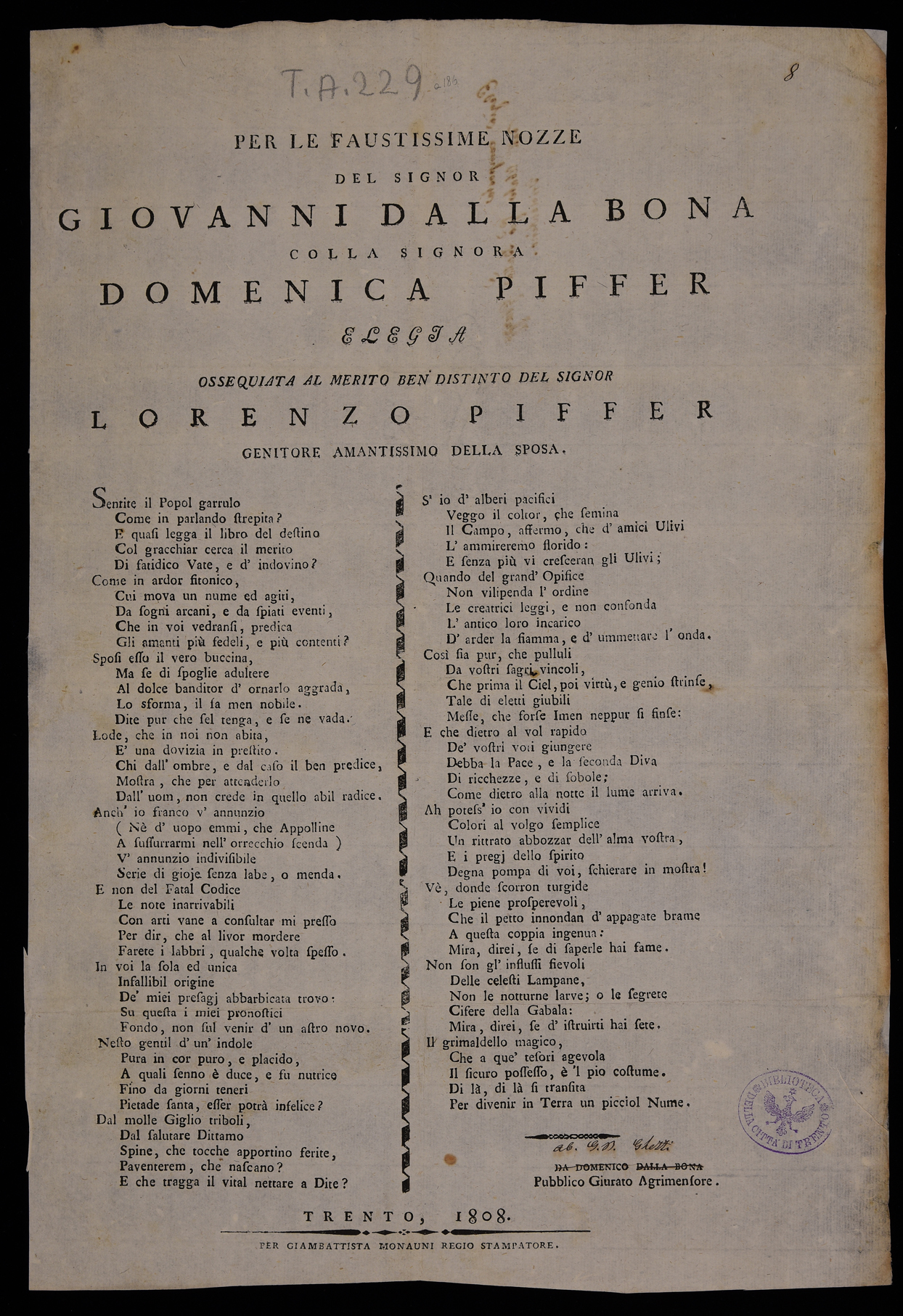 | Per le faustissime nozze del signor Giovanni Dalla Bona colla signora Domenica Piffer, elegia ossequiata al merito ben distinto del signor Lorenzo Piffer genitore amantissimo della sposa |