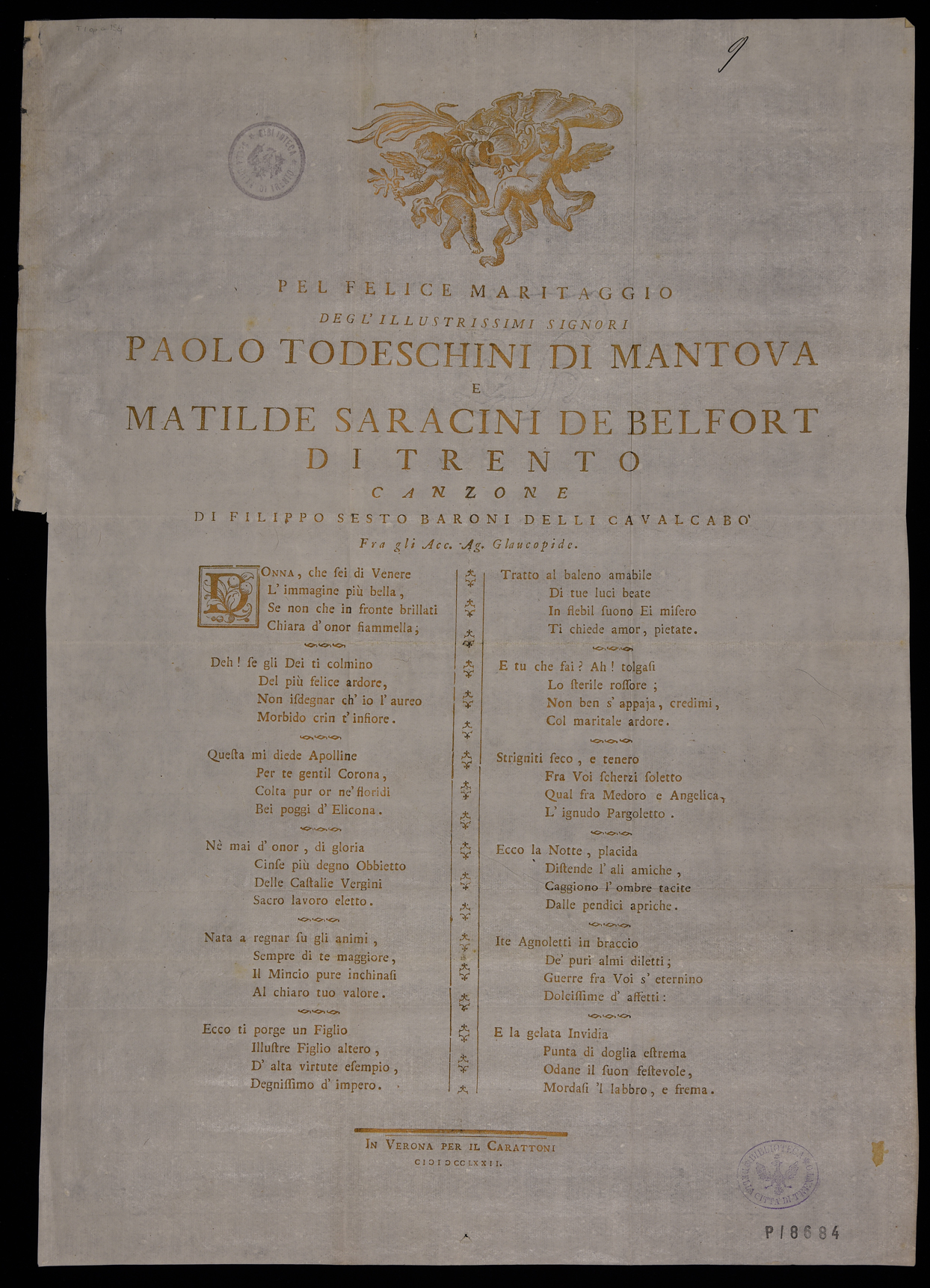 | Pel felice maritaggio degl'illustrissimi signori Paolo Todeschini di Mantova e Matilde Saracini de Belfort di Trento, canzone ... |