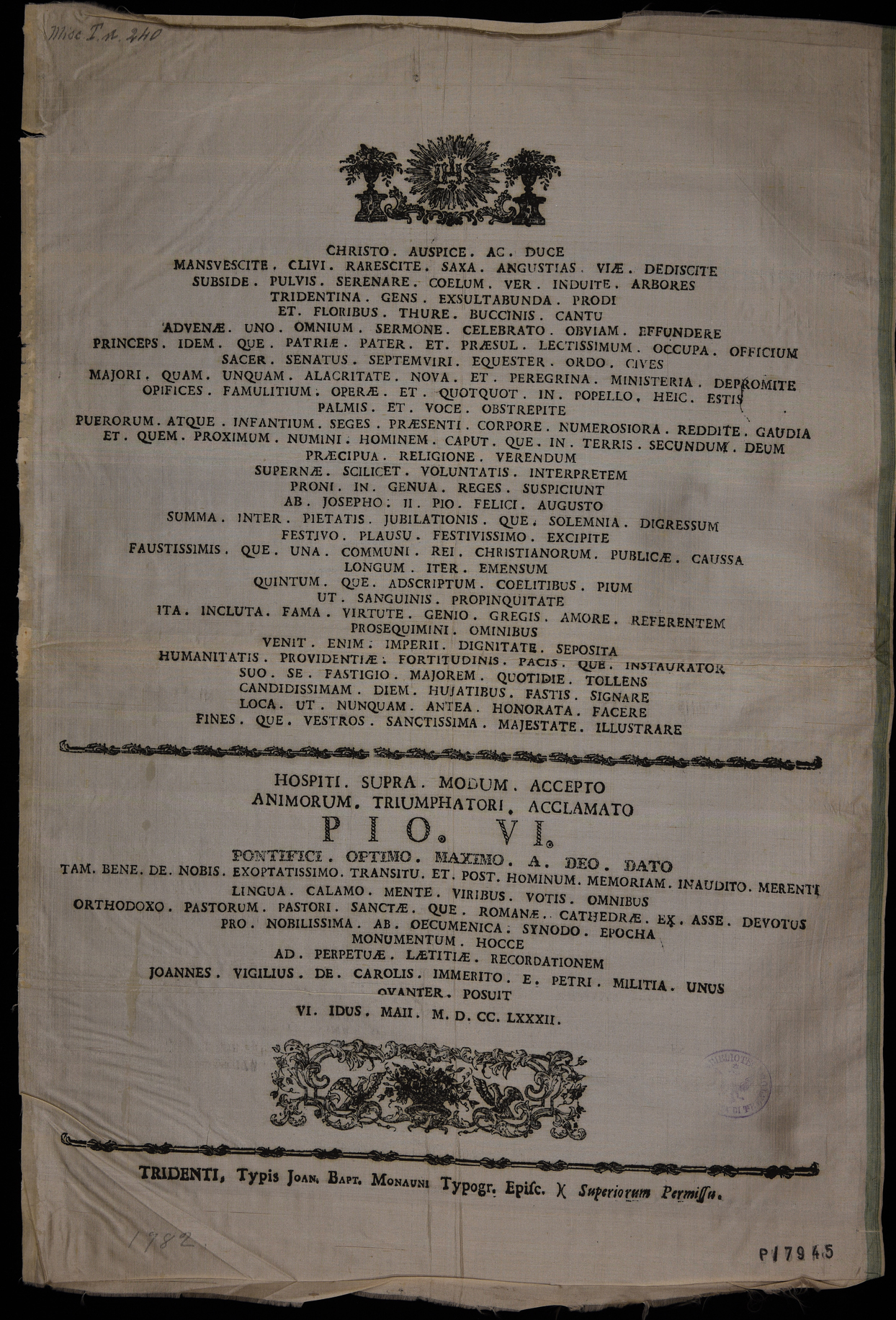 | Christo auspice ac duce mansuescite clivi rarescite saxa angustias viae dediscite ... hospiti supra modum accepto ... Pio. VI. ... Joannes Vigilius de Carolis ... posuit VI. Idus. Maii. MDCCLXXXII. |