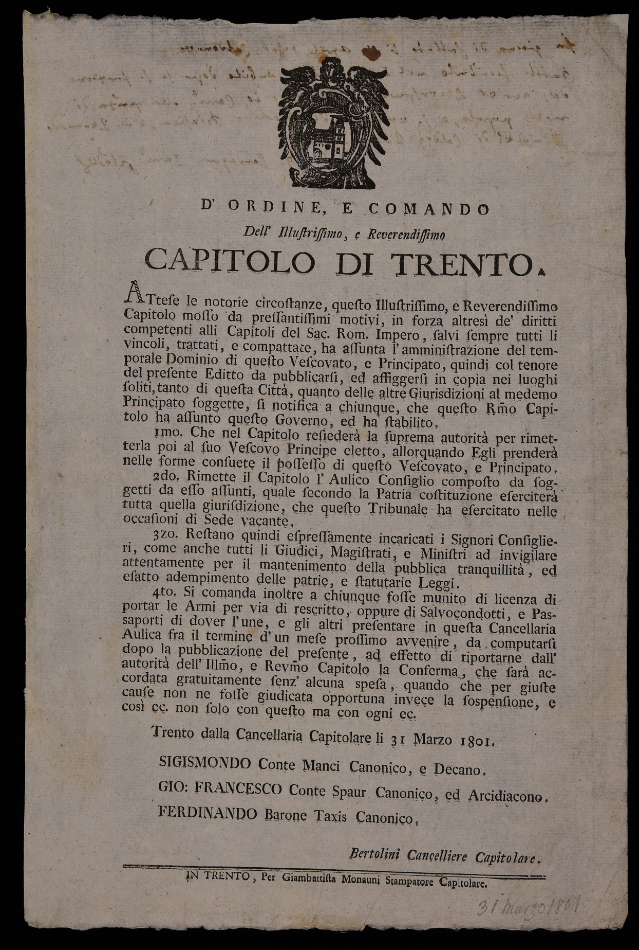 D'ordine, e comando dell'illustrissimo, e reverendissimo capitolo di Trento