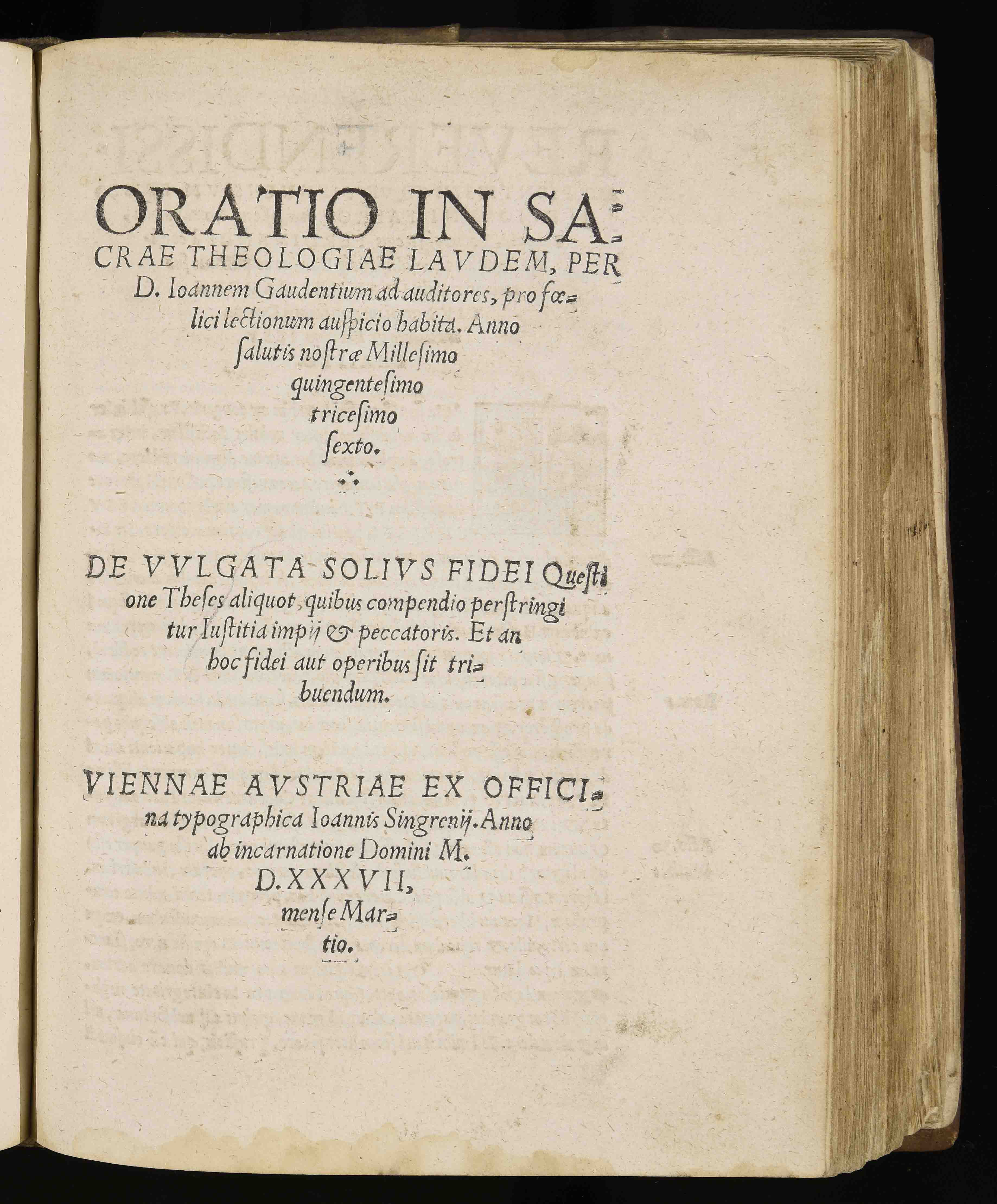 | Oratio in sacrae theologiae laudem per d. Ioannem Gaudentium ad auditores profoelici lectionum auspicio habita anno salutis nostrae millesimo quingentesimo tricesimo sexto. De vulgata solius fidei questione theses aliquot quibus compendio perstringitur iustitia impii & peccatoris. Et an hoc fidei aut operibus sit tribuendum |