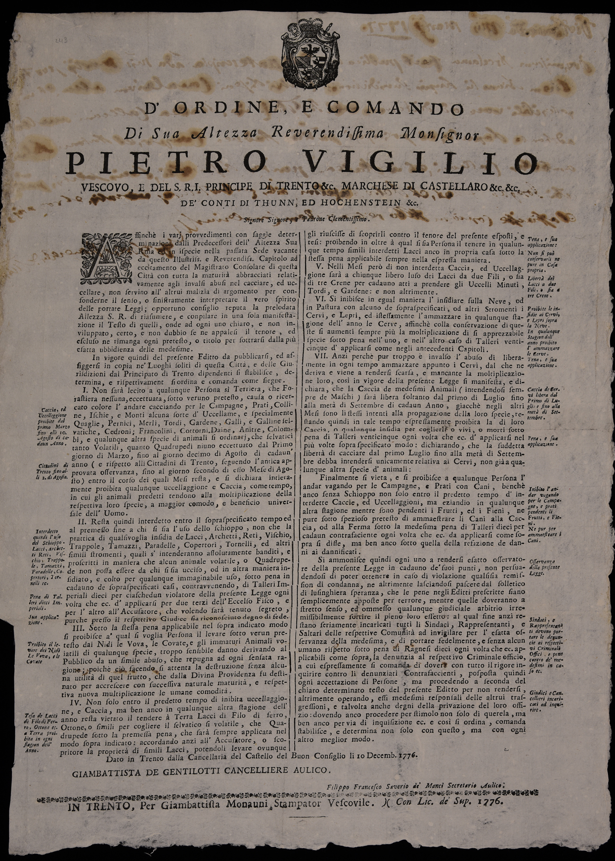 1 manifesto. Proclama su caccia e uccellagione emanato il 10 dicembre 1776 da Pietro Vigilio Thun principe-vescovo di Trento, stemma di Pietro Vigilio Thun.