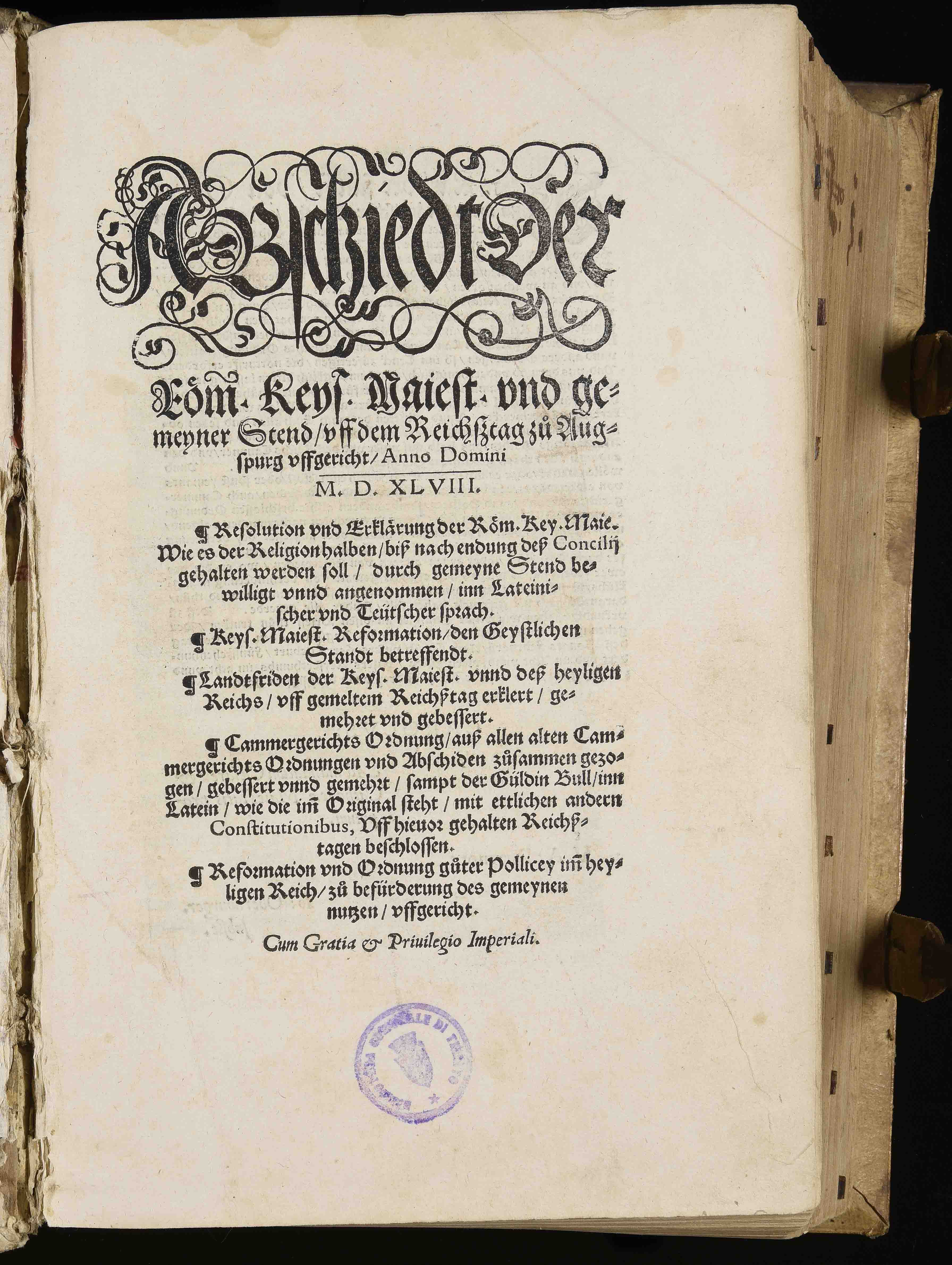 | Abschiedt der Röm. Keys. Maiest. und gemeyner Stend uff dem Reichsztag zü Augspurg uffgericht anno Domini MDXLVIII |
