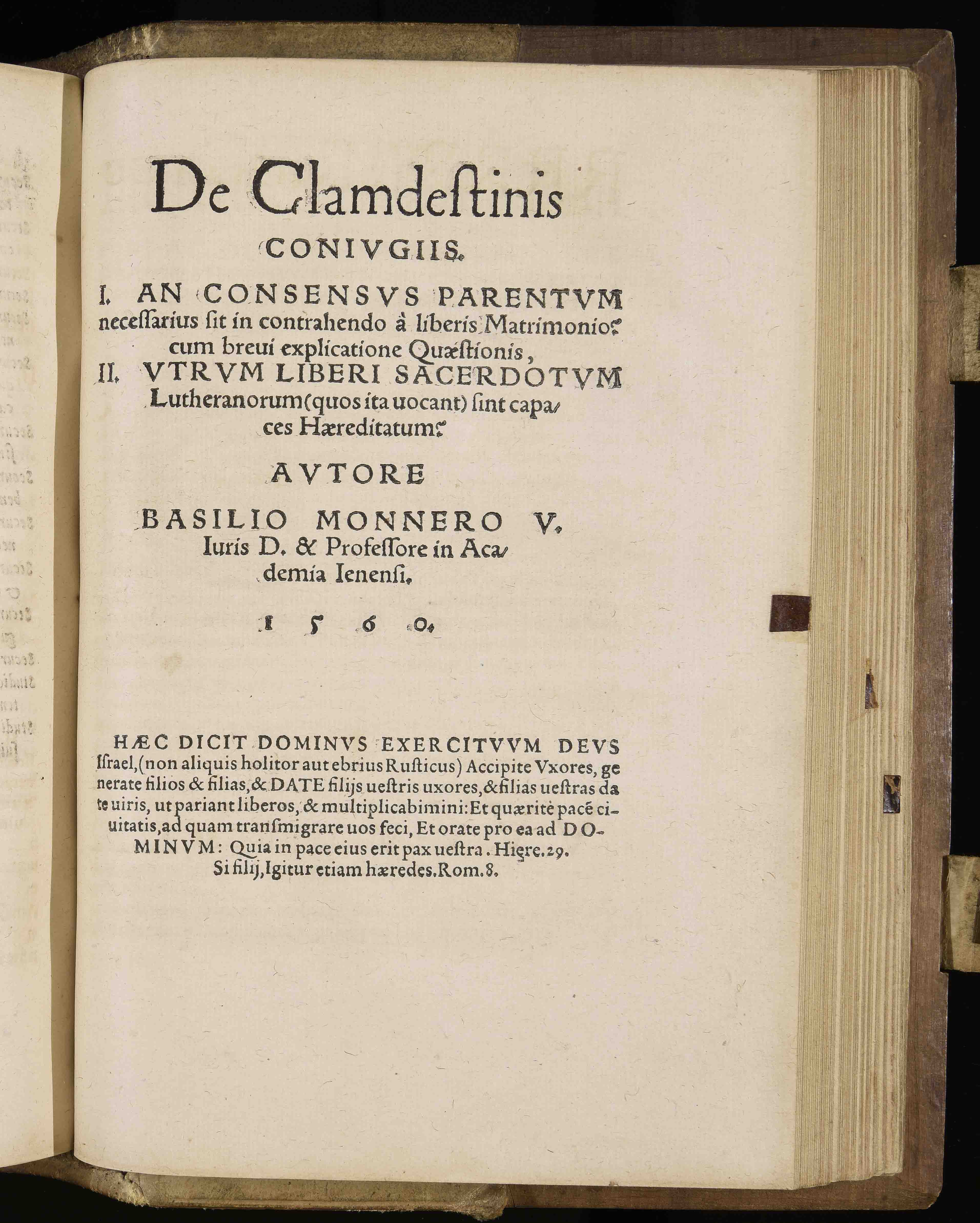 | De clamdestinis coniugiis I. An consensus parentum necessarius sit in contrahendo a liberis matrimonio: cum brevi explicatione quaestionis, II. Utrum liberi sacerdotum Lutheranorum (quos ita vocant) sint capaces haereditatum |
