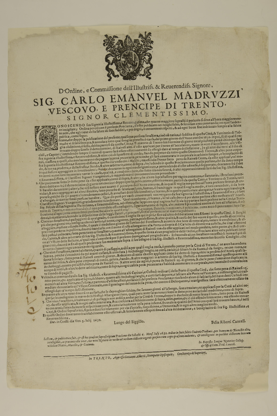 Proclama sui forestieri emanato il 5 luglio 1630 da Carlo Emmanuele Madruzzo, principe-vescovo di Trento, e sottoscritto da Felice Alberti, presenza del testo della pubblicazione, avvenuta il 6 luglio 1630 ad opera di Giovanni de Balchis, alla presenza di Giovanni Battista Longo
