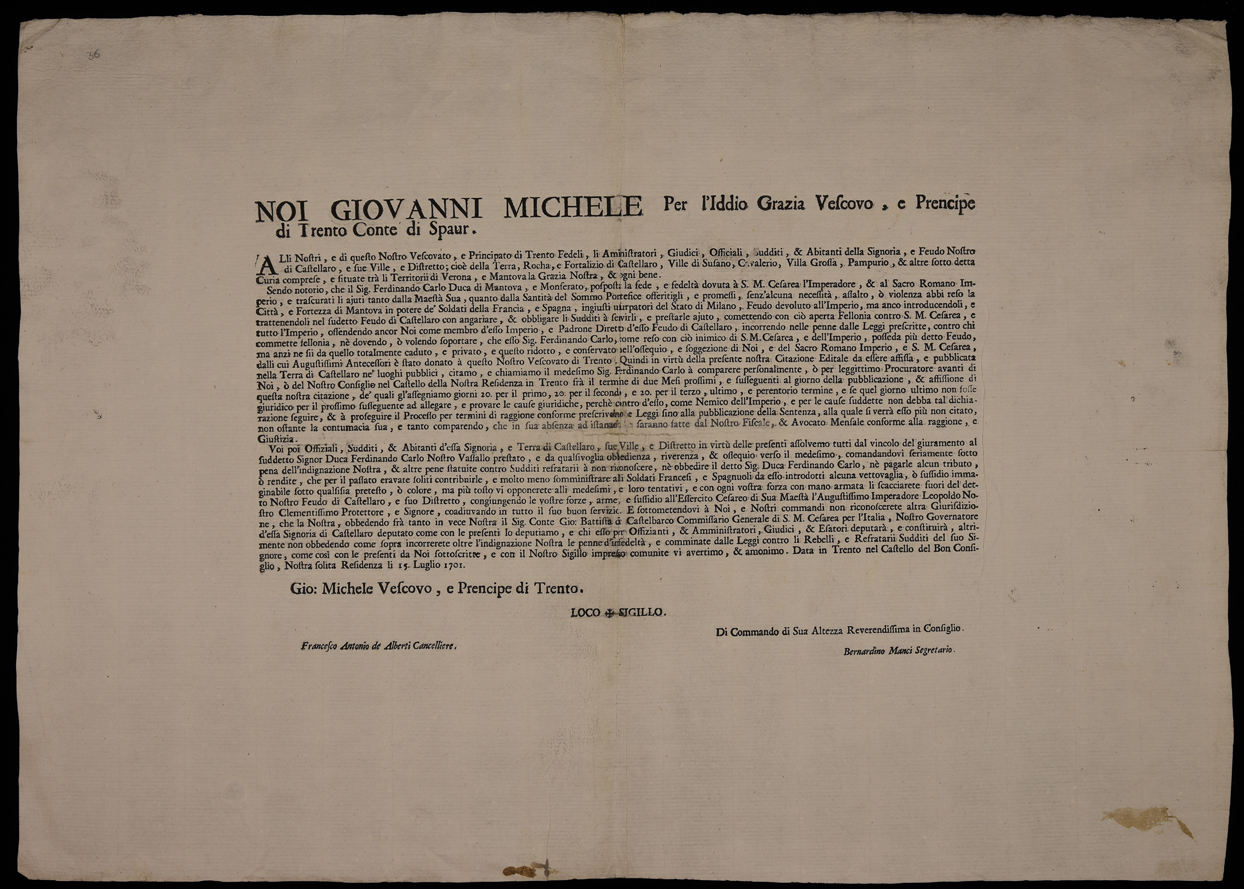 Proclama sul tradimento di Ferdinando Carlo, duca di Mantova emanato il 15 luglio 1701 da Giovanni Michele Spaur principe-vescovo di Trento, stampa priva di fregi tipografici, attribuibile alla tipografia di Giovanni Parone, la sola attiva a Trento nel 1701.