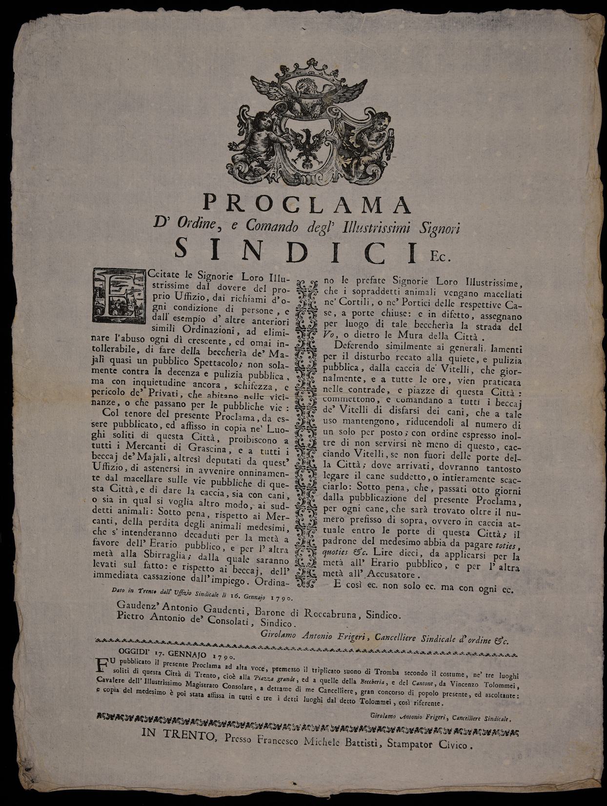 Proclama d'ordine, e comando degl'illustrissimi signori sindici ec.