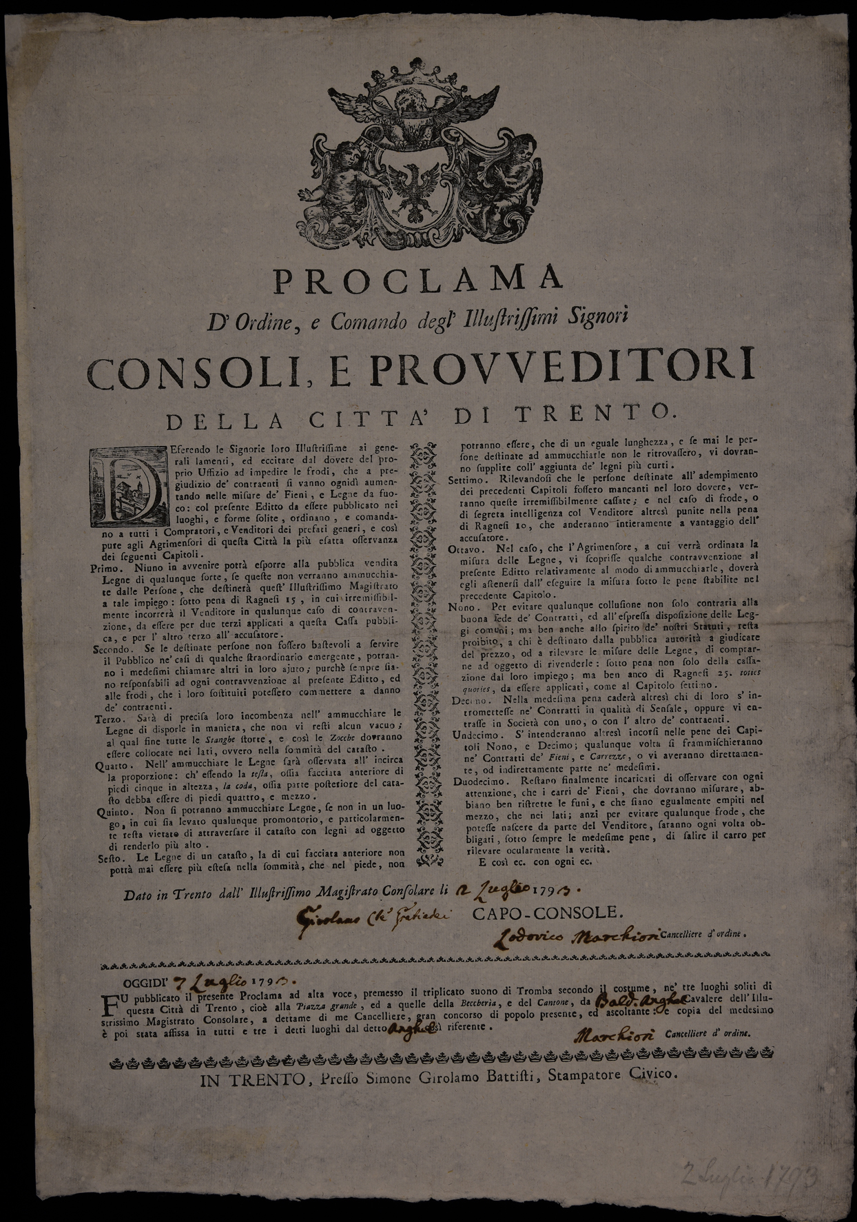 | Proclama d'ordine, e comando degl'illustrissimi signori consoli, e provveditori della città di Trento |