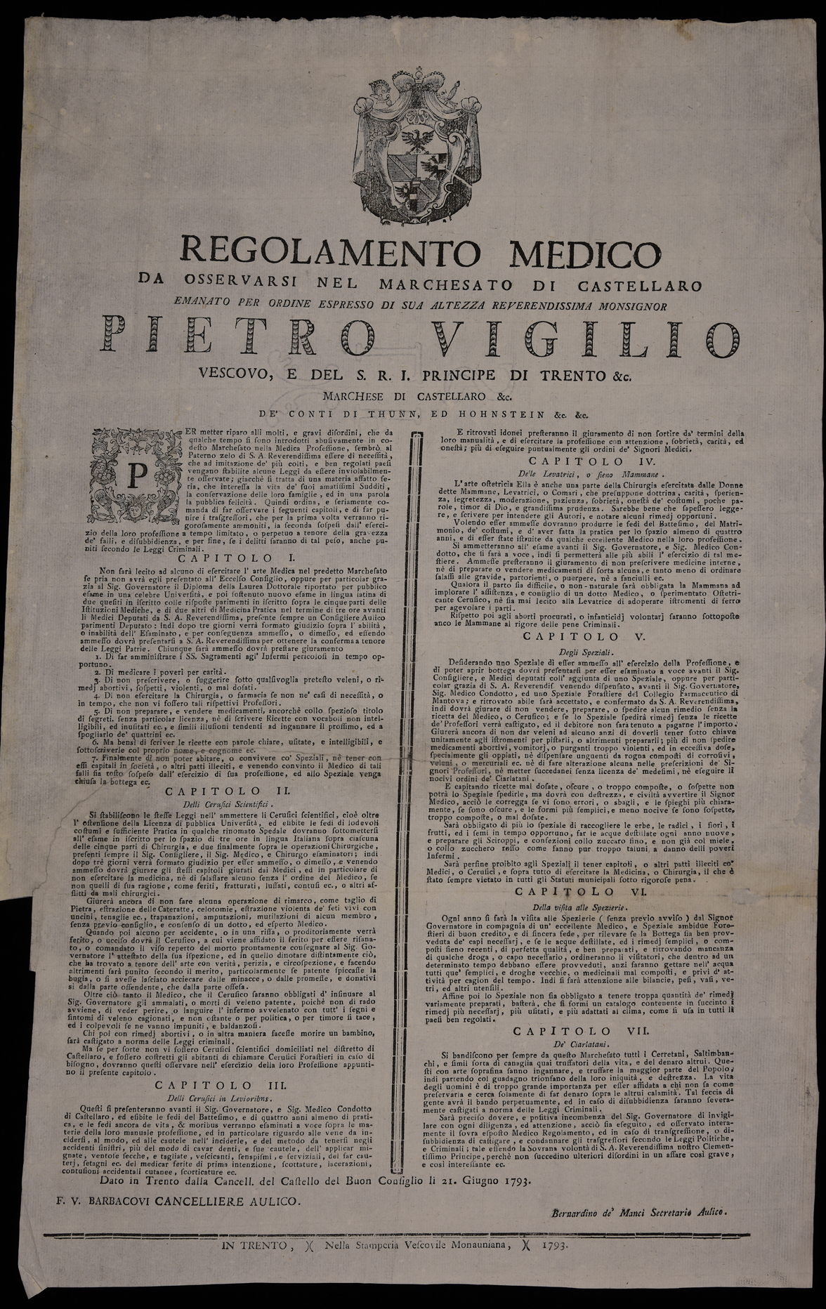 Proclama sull’esercizio della professione medica nel territorio di Castellaro Mantovano, emanato il 21 giugno 1793 da Pietro Vigilio Thun principe-vescovo di Trento, stemma di Pietro Vigilio Thun.