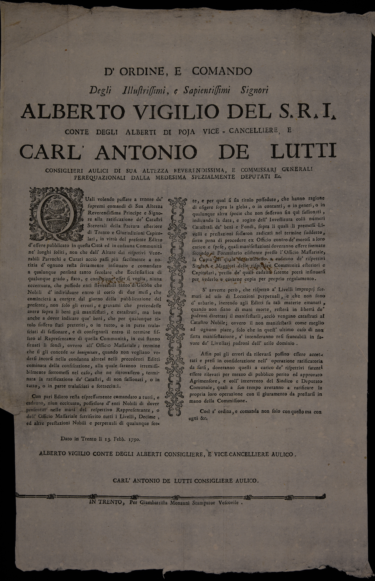 | D'ordine, e comando degli illustrissimi, e sapientissimi signori Alberto Vigilio del S.R.I. ... e Carl'Antonio de Lutti ... |