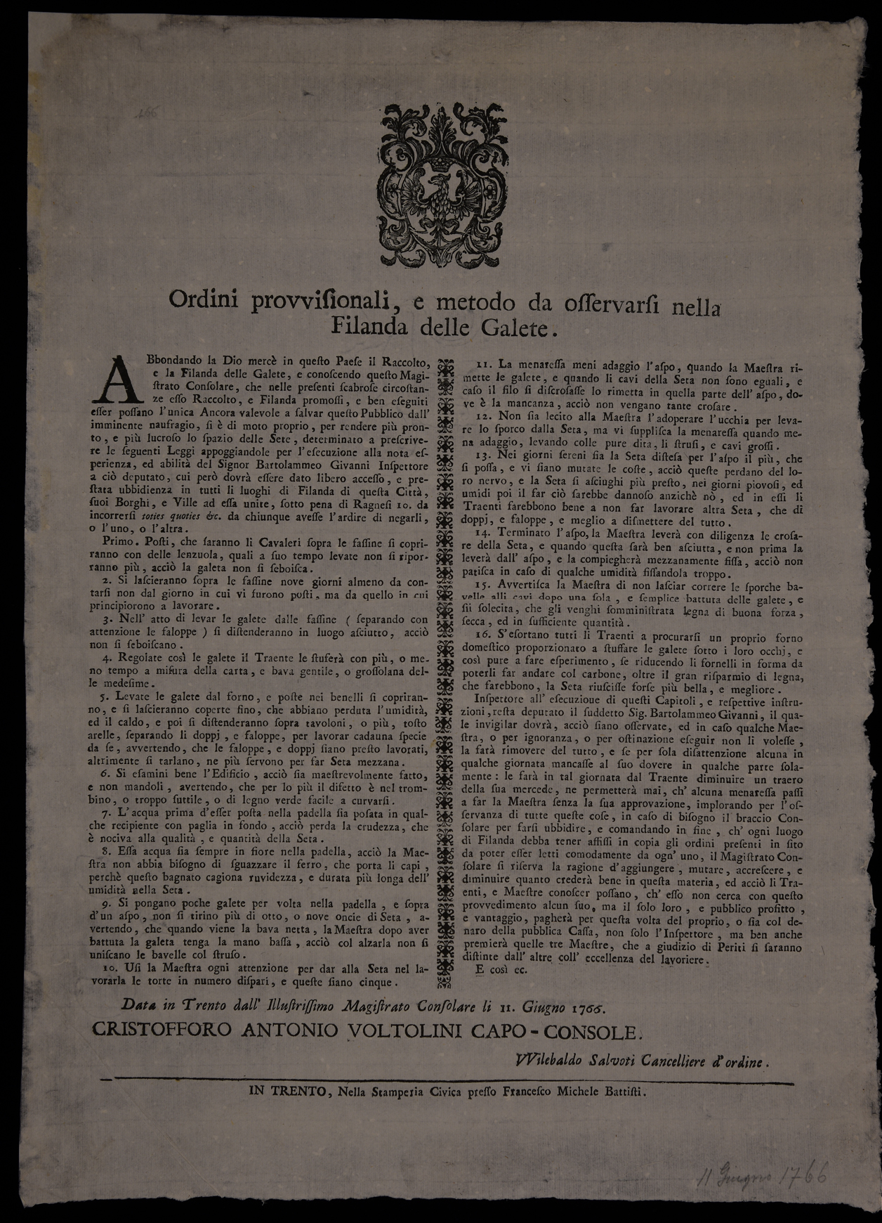 Ordini provvisionali, e metodo da osservarsi nella filanda delle galete