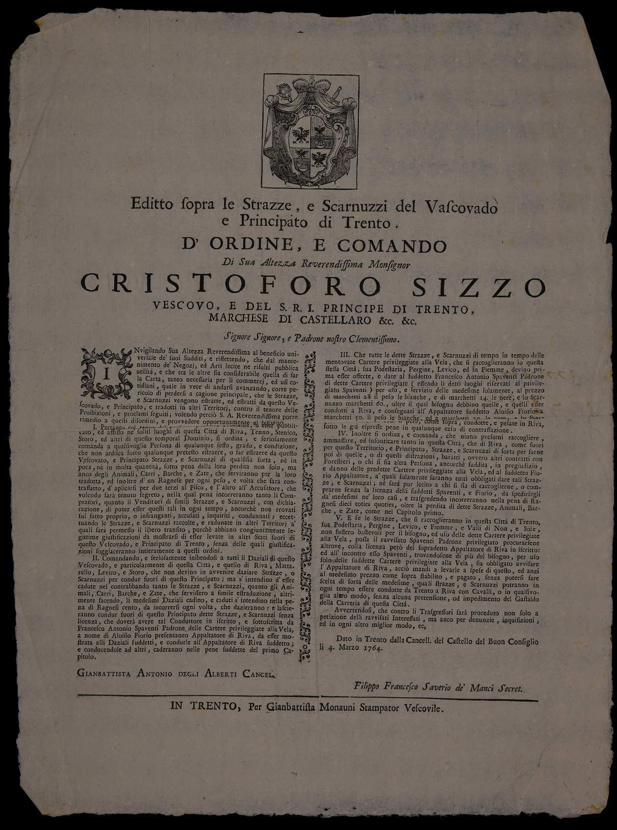 1 manifesto. Proclama sulle cartiere emanato il 4 marzo 1764 da Cristoforo Sizzo, principe-vescovo di Trento, stemma di Cristoforo Sizzo