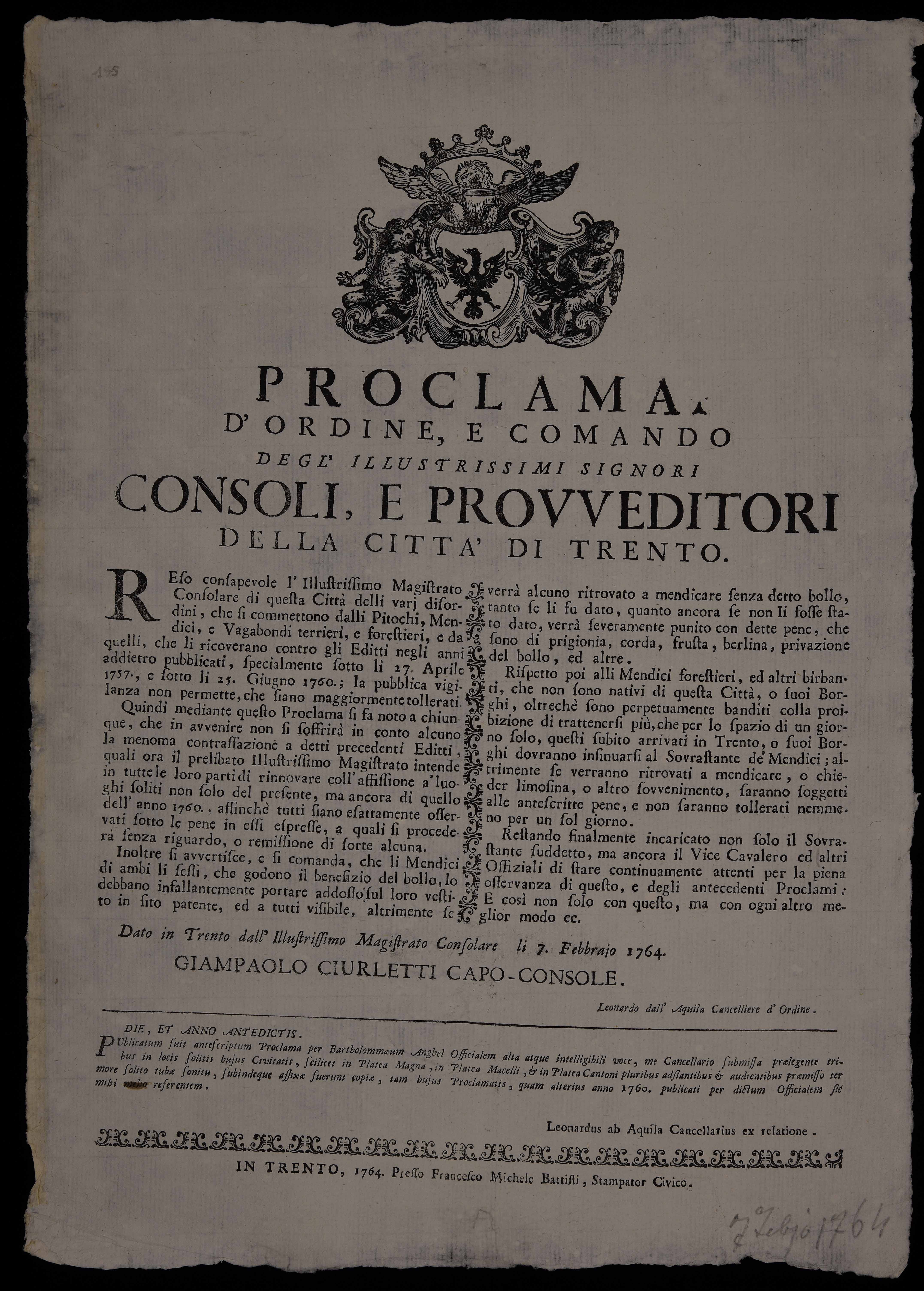 Proclama su mendicanti e vagabondi emanato il 7 febbraio 1764 dal Magistrato consolare di Trento, stemma del Magistrato consolare di Trento, sottoscritto da Giampaolo Ciurletti (capo console), da Leonardo Dall'Aquila (cancelliere) e da Bartolomeo Anghel (ufficiale).