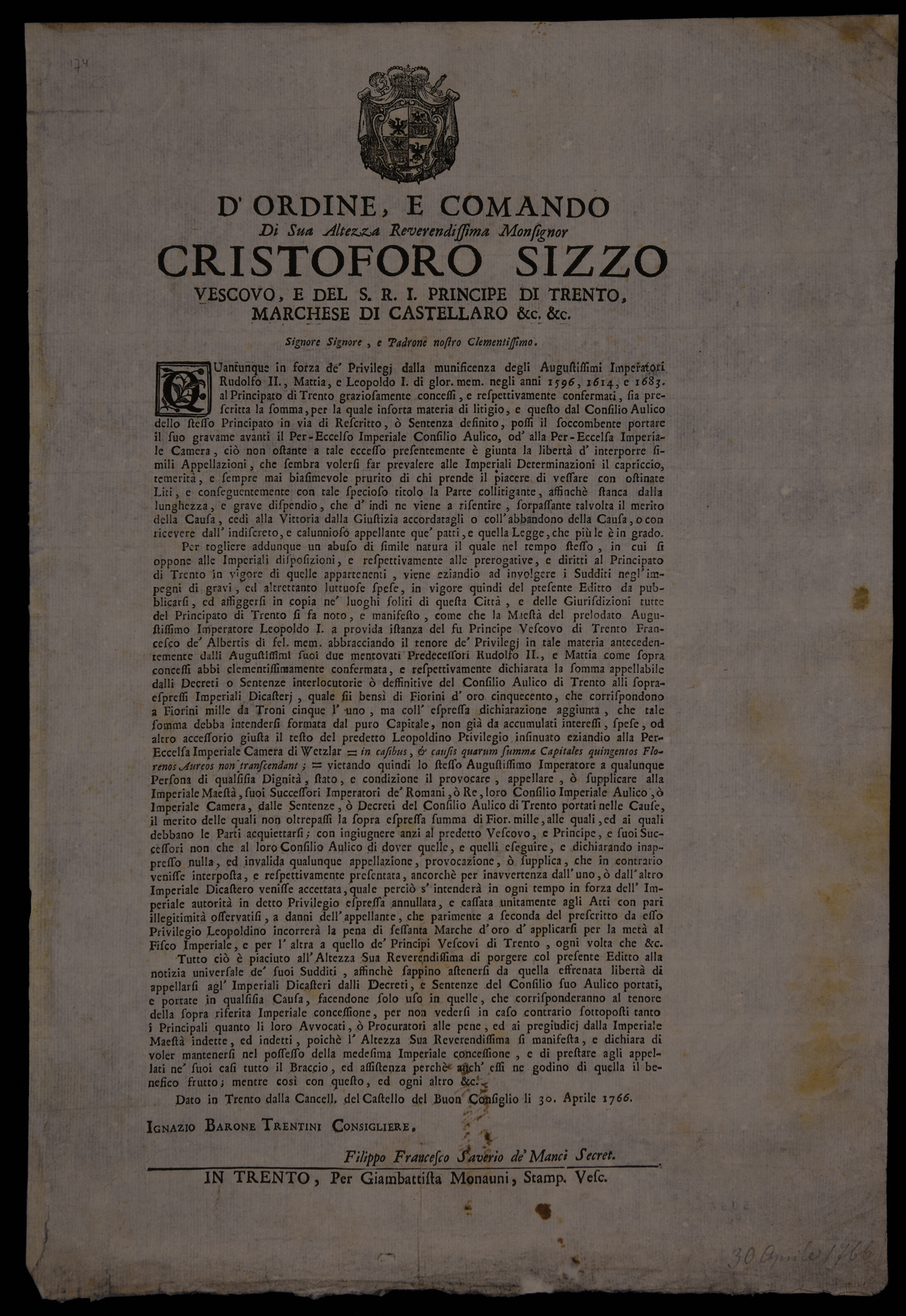 | D'ordine, e comando di sua altezza reverendissima monsignor Cristoforo Sizzo vescovo, e del S.R.I. principe di Trento ... |