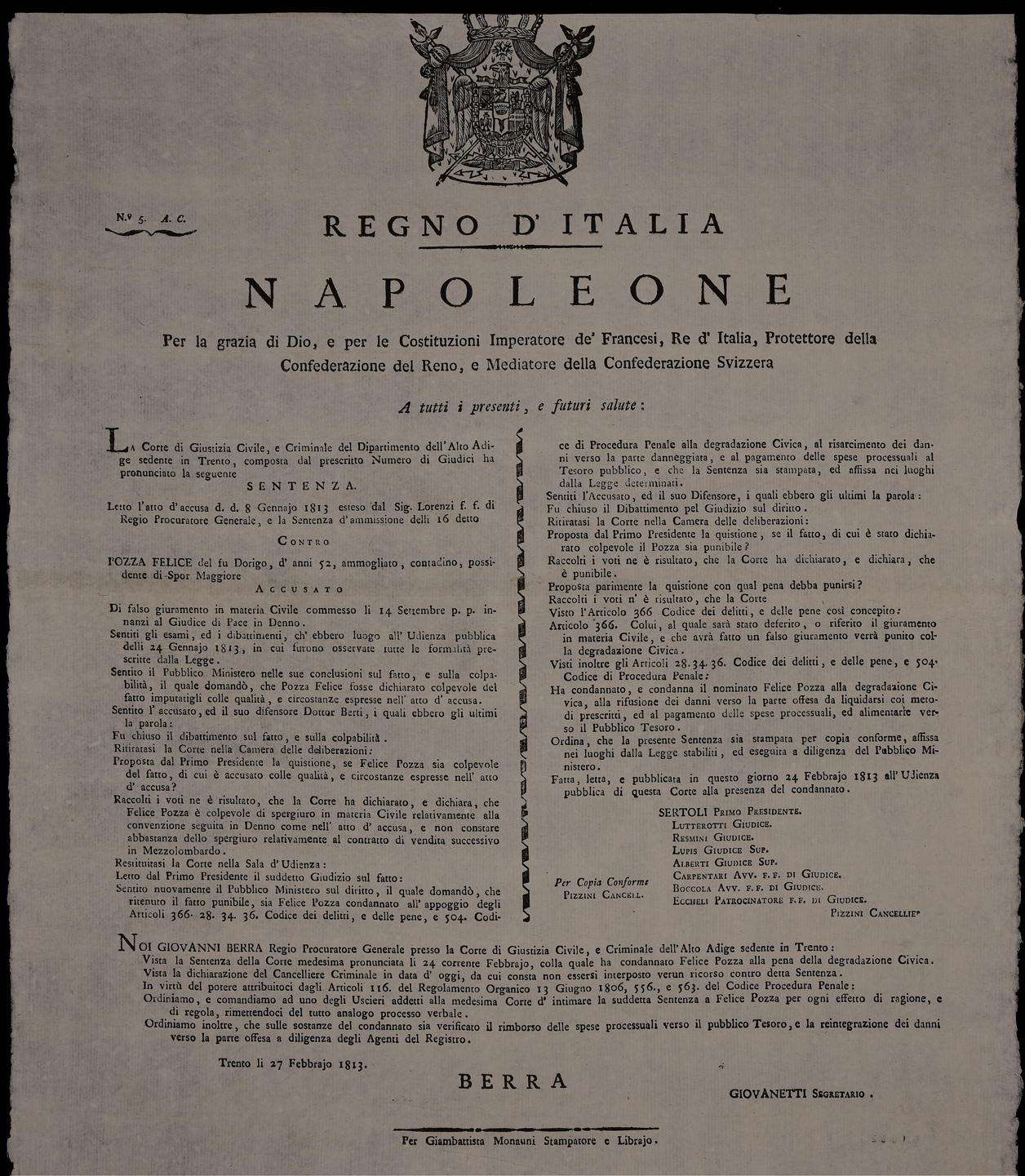 La Corte di giustizia civile, e criminale del Dipartimento dell'Alto Adige sedente in Trento, composta dal prescritto numero di giudici ha pronunciato la seguente sentenza ...