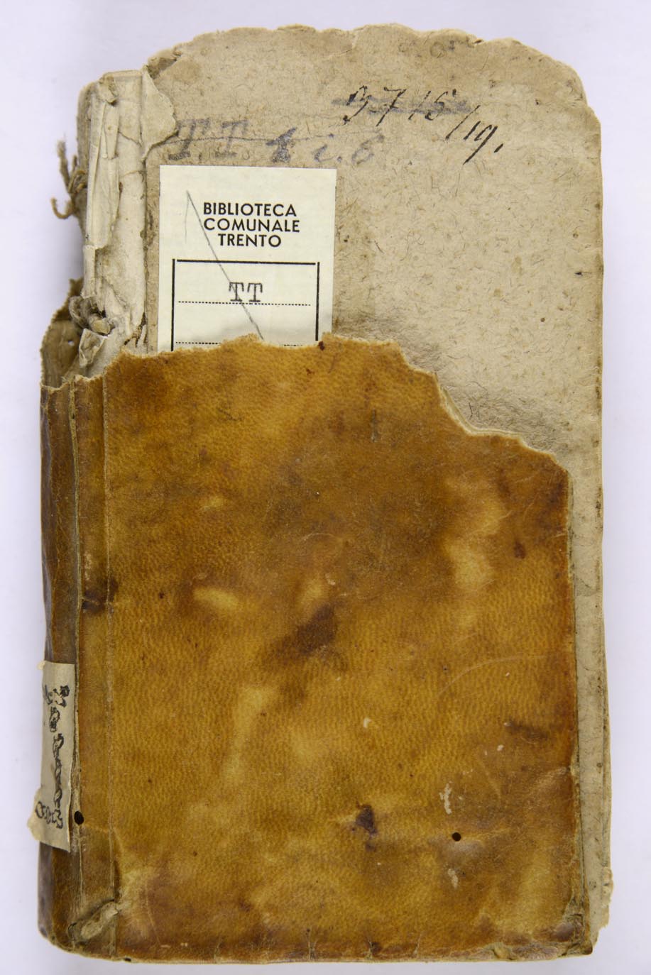 L’esemplare è mutilo, ma trattandosi dell’unica copia della seconda emissione non è possibile sapere con certezza quante carte siano cadute. Note manoscritte di conto al recto della c. di guardia: feb. 1658 galede duodecim, troni 156 9 decembris 1665 […]. Ex libris della Biblioteca e del conte Giovanni Martini di Calliano sul verso del piatto anteriore, timbro della Biblioteca al frontespizio, legatura in piena pergamena su cartoni, coperta parzialmente mancante, c. di guardia anteriore, mm. 140x75x25, talloncino di carta al dorso con la segnatura E.I.S, provenienza: Antonio Mazzetti, antiche segnature di collocazione: 3716/19 (Mazzetti), TT 1 i 6, TT k 60 (Biblioteca comunale di Trento). Numero d’inventario della Biblioteca comunale di Trento: x/1590 a c. O12v.