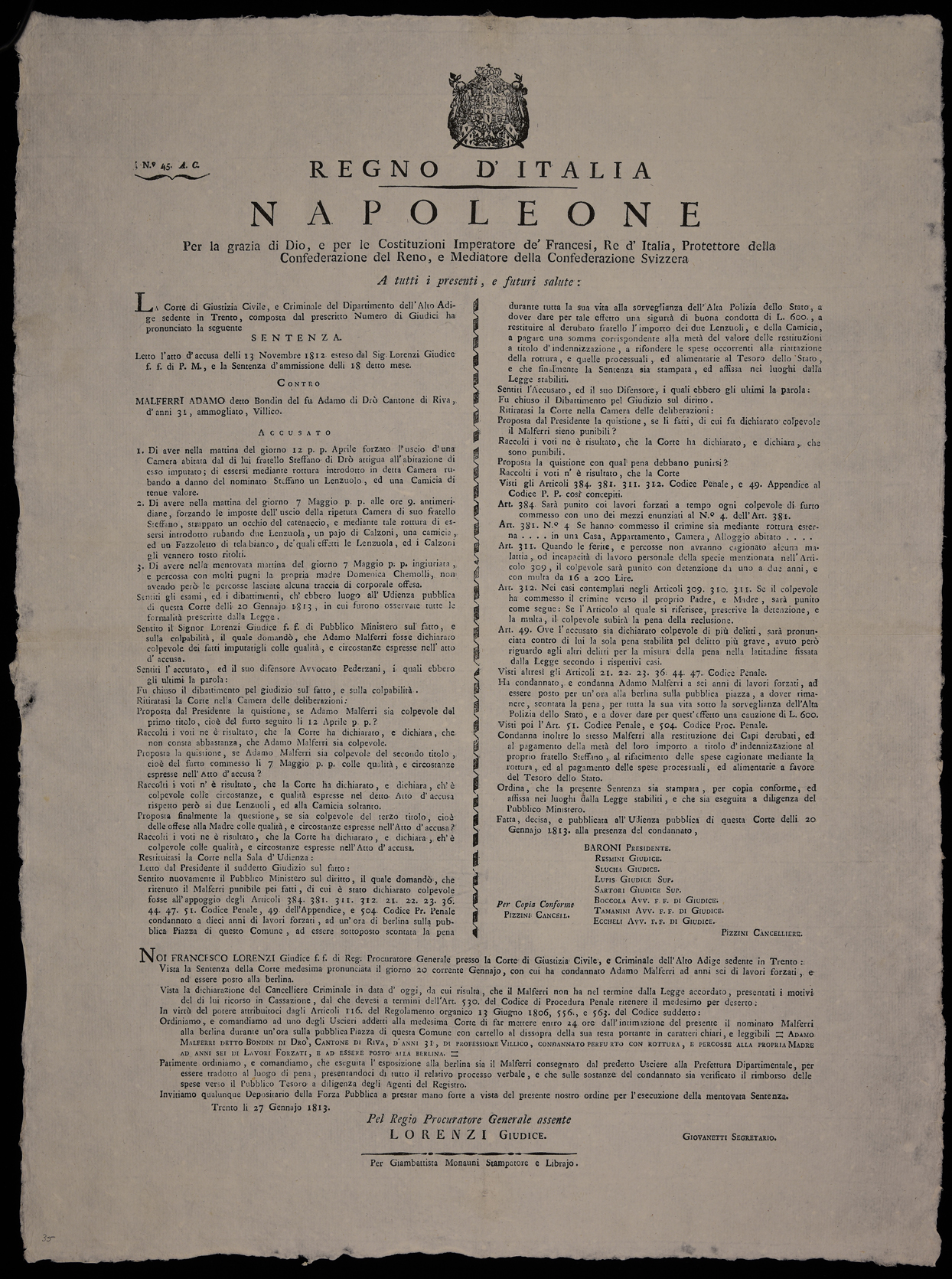 La Corte di giustizia civile, e criminale del Dipartimento dell'Alto Adige sedente in Trento, composta dal prescritto numero di giudici ha pronunciato la seguente sentenza ...
