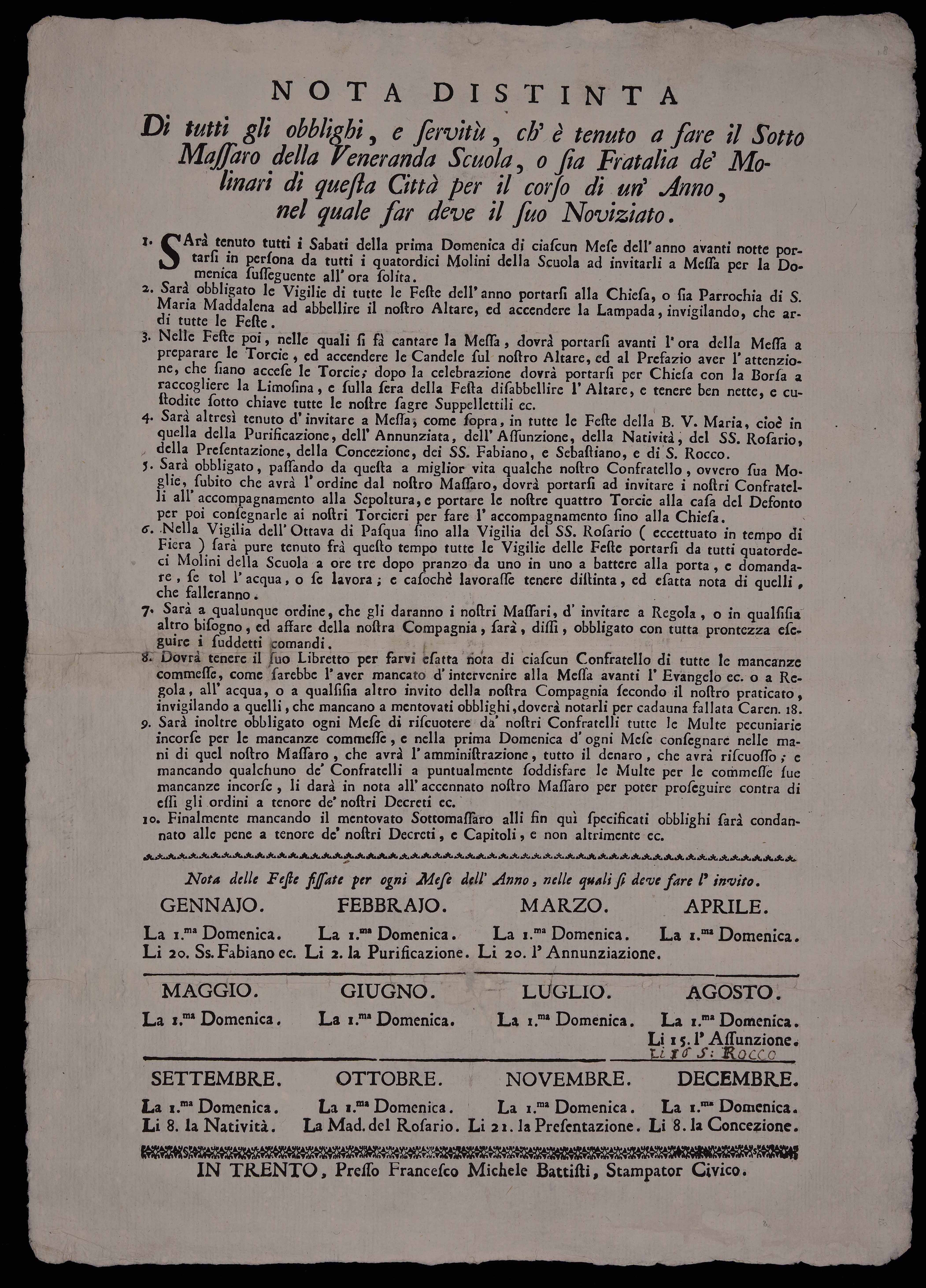 | Nota distinta di tutti gli obblighi, e servitù, ch'è tenuto a fare il sotto massaro della veneranda scuola, o sia Fratalia de' Molinari di questa città per il corso di un'anno, nel quale far deve il suo noviziato |