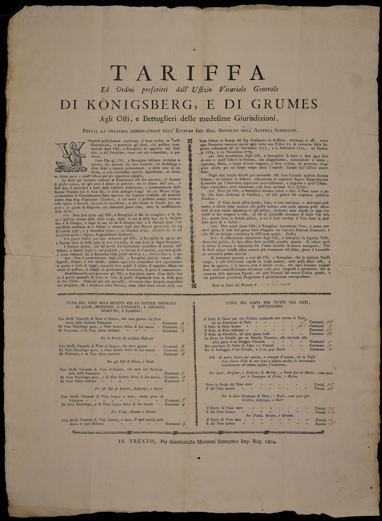 | Tariffa ed ordini prescritti dall'Uffizio Vicariale Generale di Königsberg, e di Grumes agli osti, e bettoglieri delle medesime giurisdizioni ... |