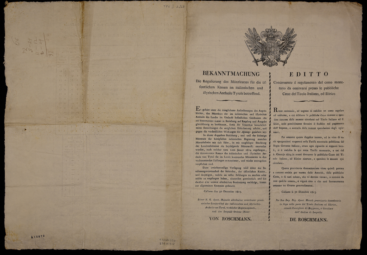 | Editto concernente il regolamento del corso monetario da osservarsi presso le pubbliche casse del Tirolo italiano, ed illirico |