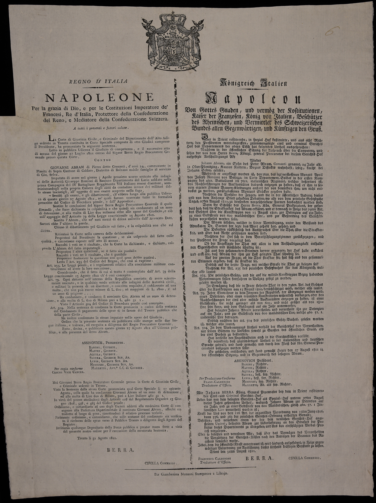 La Corte di giustizia civile, e criminale del Dipartimento dell'Alto Adige sedente in Trento costituita in Corte Speciale composta di otto giudici ... ha pronunciato la seguente sentenza ...