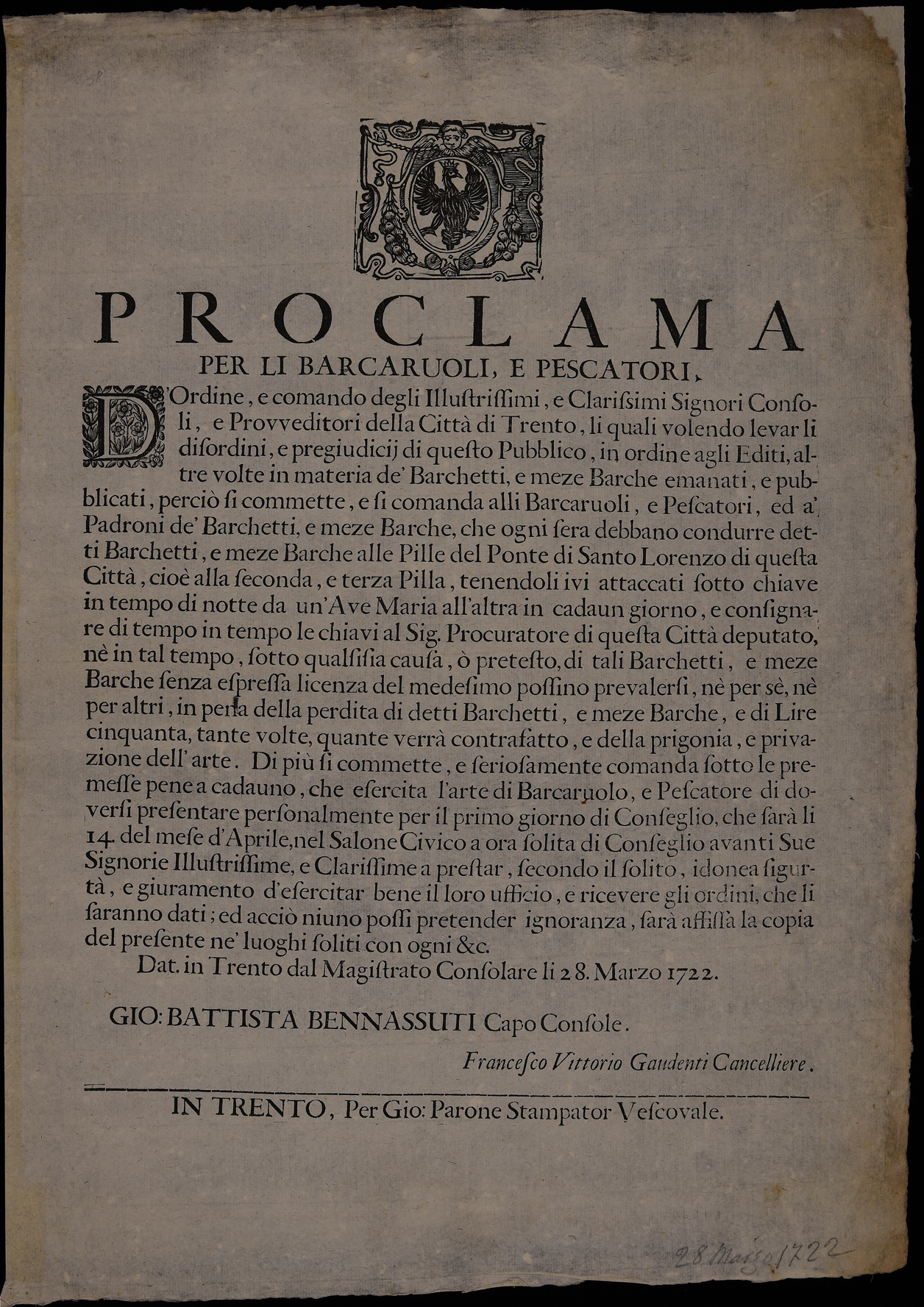 Proclama sulla regolamentazione dell'attività di barcaioli e pescatori emanato il 28 marzo 1722 dal Magistrato consolare di Trento, stemma del Magistrato consolare di Trento, esiste una variante priva di data e sottoscrizione.
