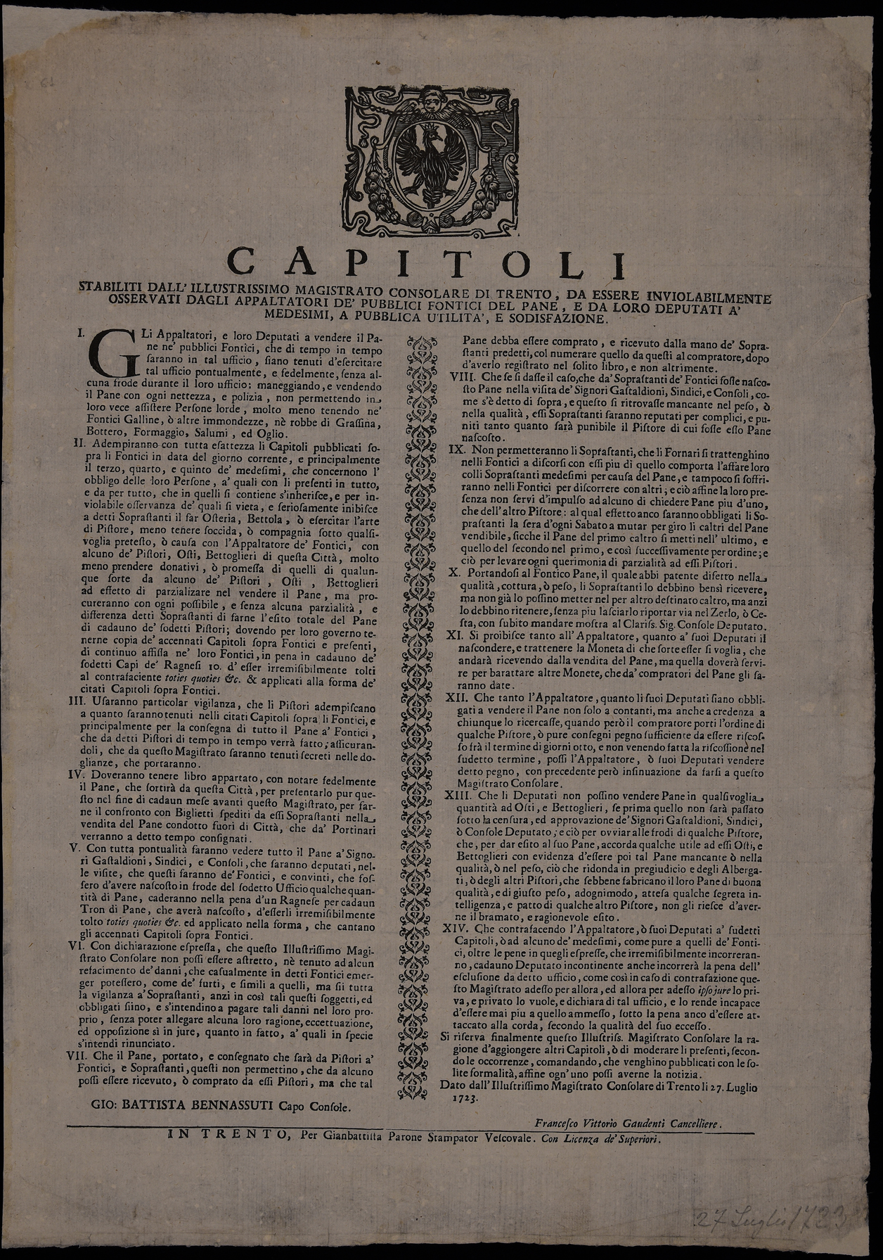 Proclama sulla gestione dei magazzini del pane emanato il 27 luglio 1723 dal Magistrato consolare di Trento, stemma del Magistrato consolare di Trento.