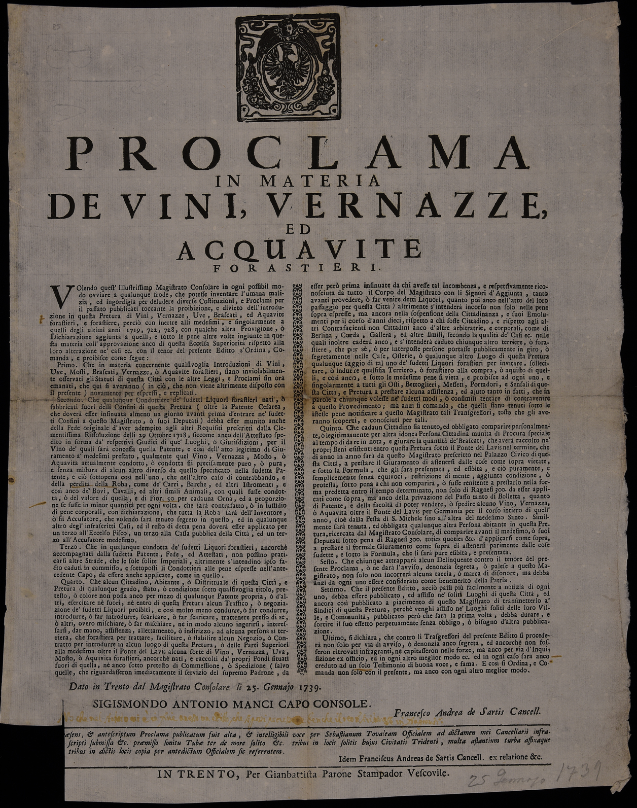 1 manifesto. Proclama su vini e grappe emanato il 25 gennaio 1739 dal Magistrato consolare di Trento, stemma del Magistrato consolare di Trento, sottoscritto da Sigismondo Antonio Manci e Francesco Andrea de Sartis.
