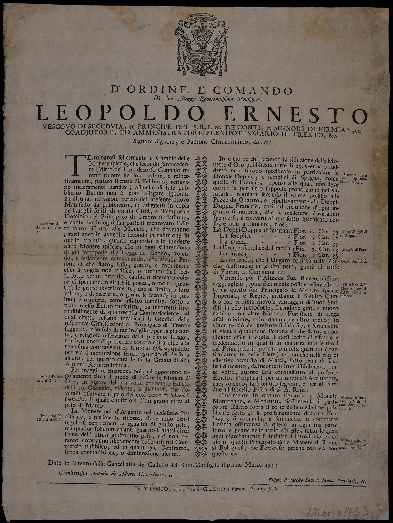 Proclama sul cambio della moneta spicciola emanato il 1 marzo 1753 da Leopoldo Ernesto Firmian, stemma di Leopoldo Ernesto Firmian, sottoscritto da Giambattista Antonio Alberti (cancelliere) e da Filippo Francesco Saverio Manci (segretario).